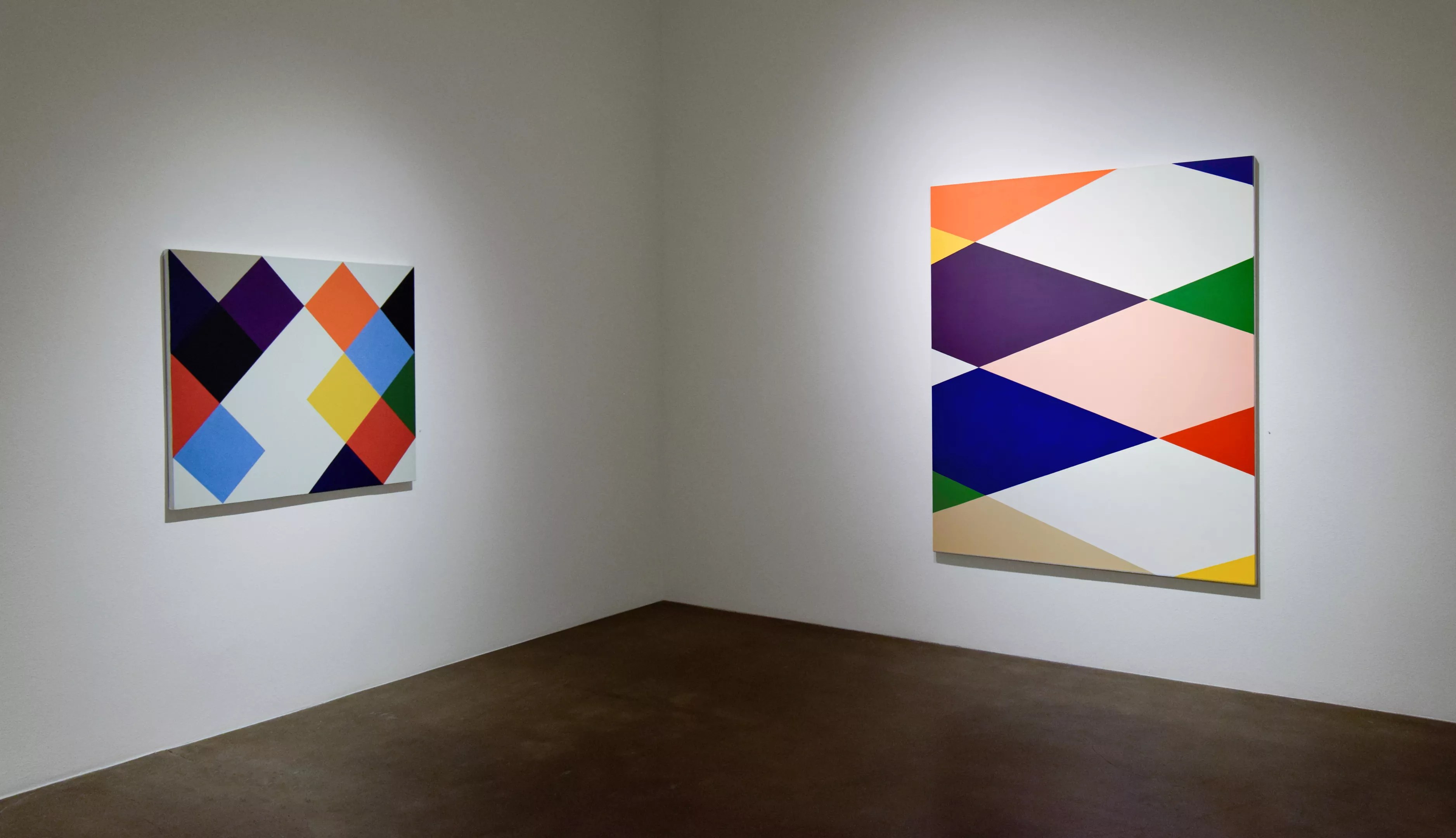 Installation view of Stephen Westfall, with “After Sunrise” (left) and “Reclining Harlequin.”