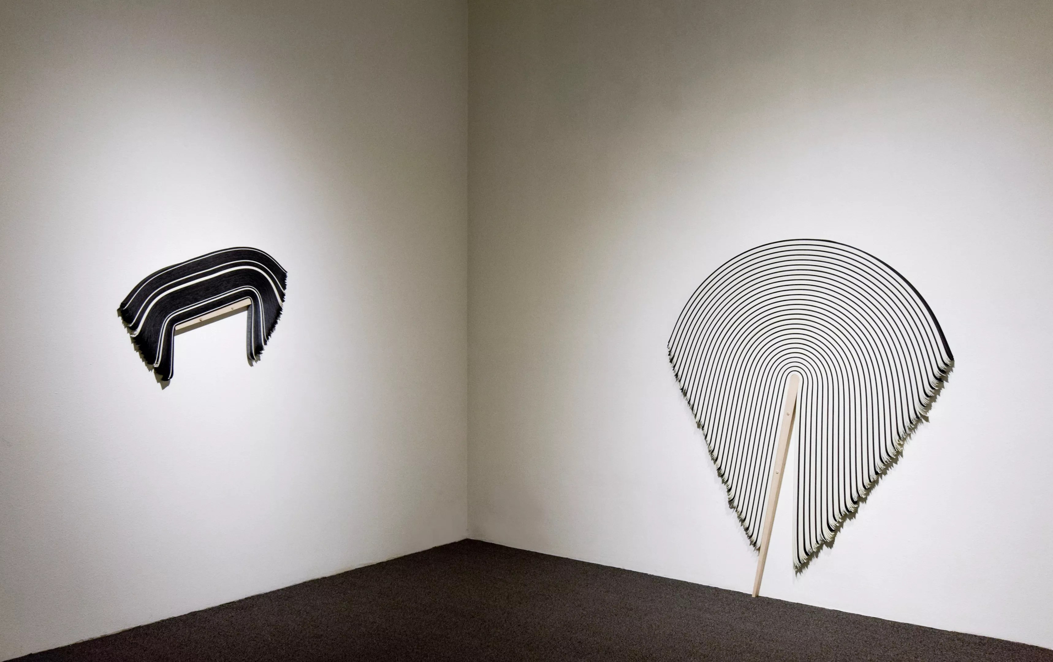 Derrick Velasquez’s untitled vinyl and maple wall sculptures.