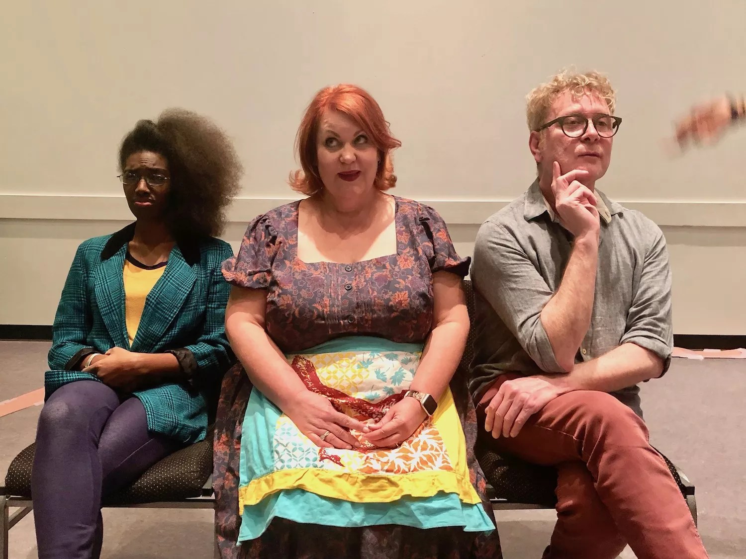 Flame Broiled actors Ilasiea Gray, Emma Messenger and Gary Norman in rehearsal.