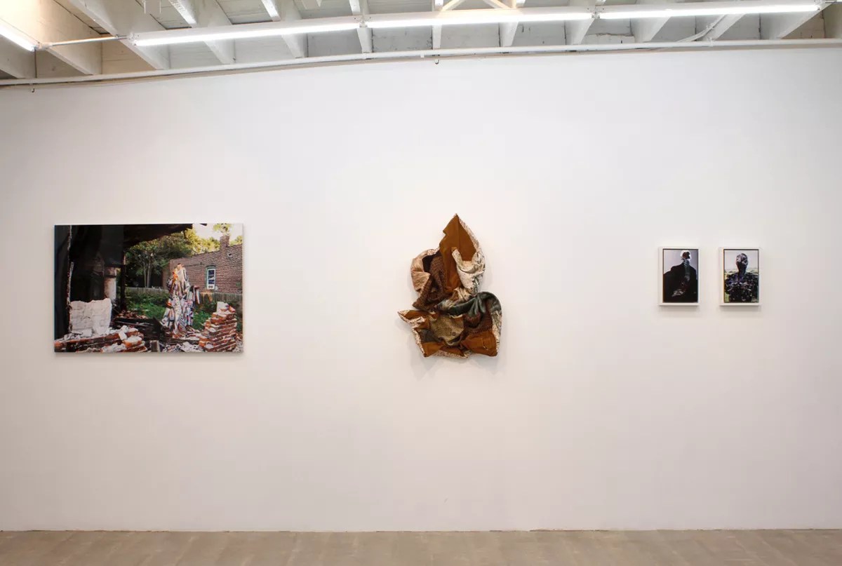 Kincaid is also represented by an actual quilted wall sculpture, which might seem strange in a photo show. Some of the patterns on the fabrics that make up the piece have been printed with digital reproductions of photos, however, so there’s a connection. The patterns he creates are based on digital photos of his environment.