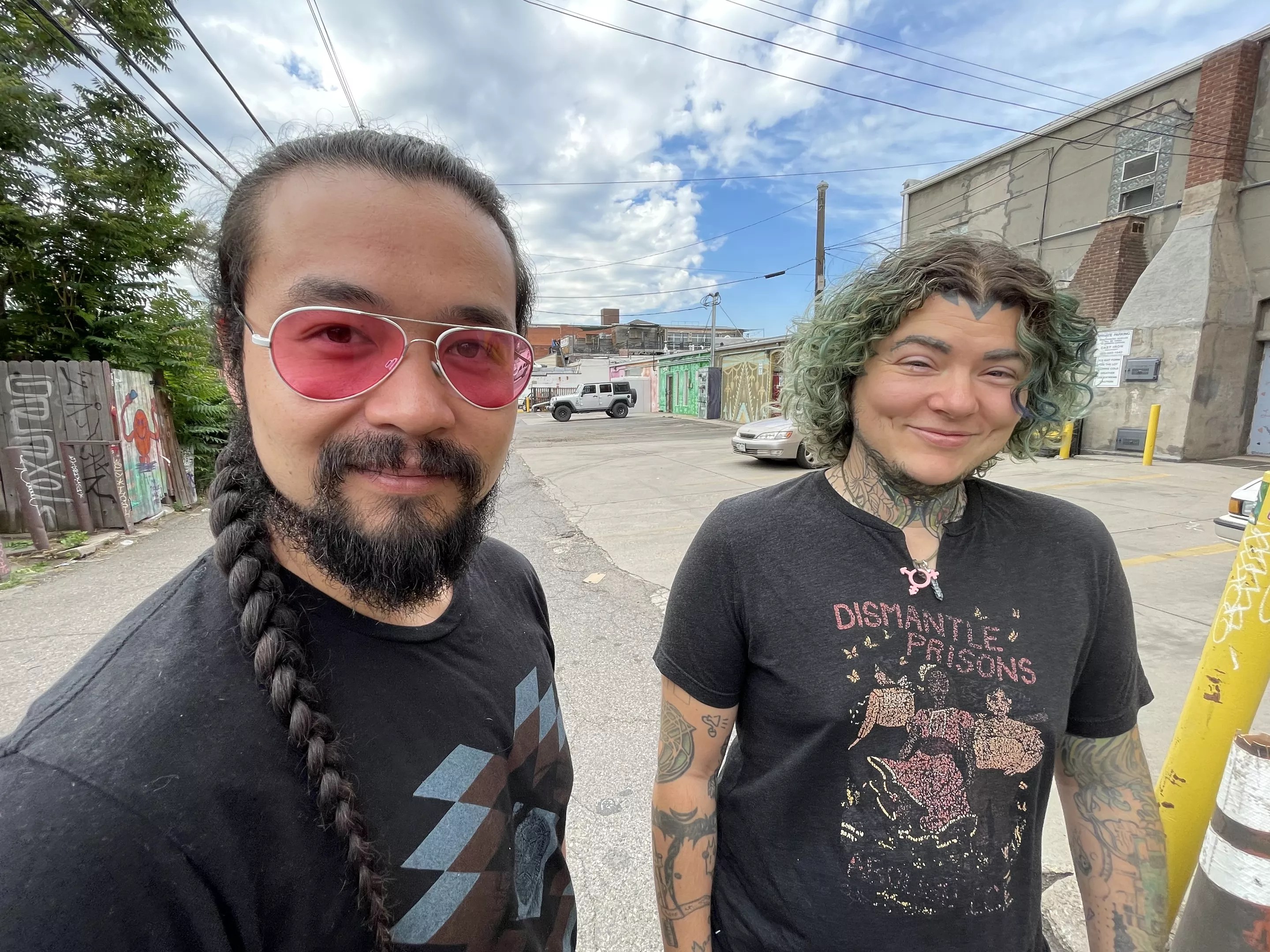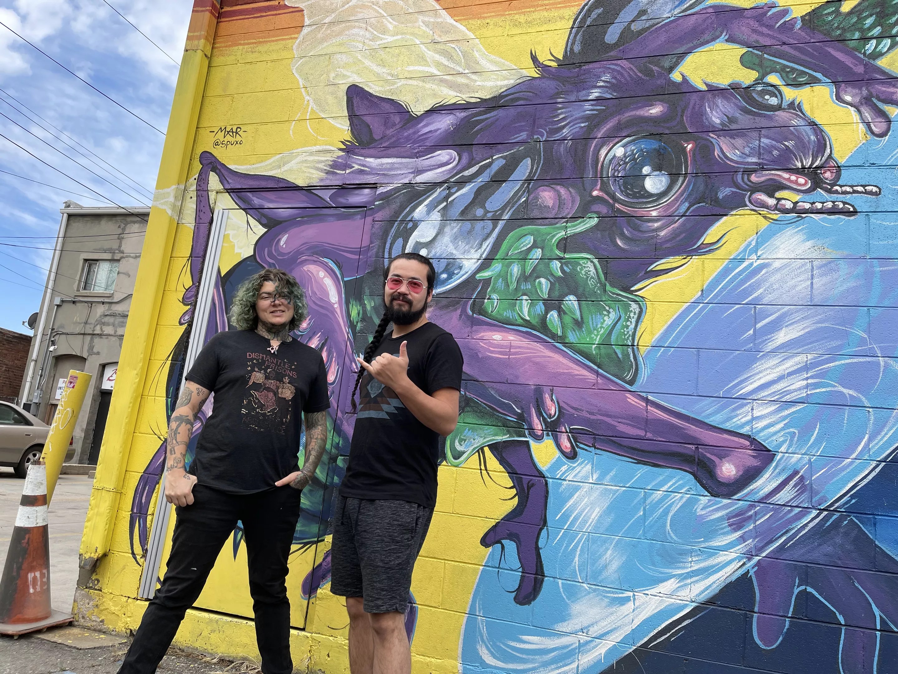 Mar Williams and Ryan Foo stand in front of Williams’s mural in a Baker neighborhood alley.