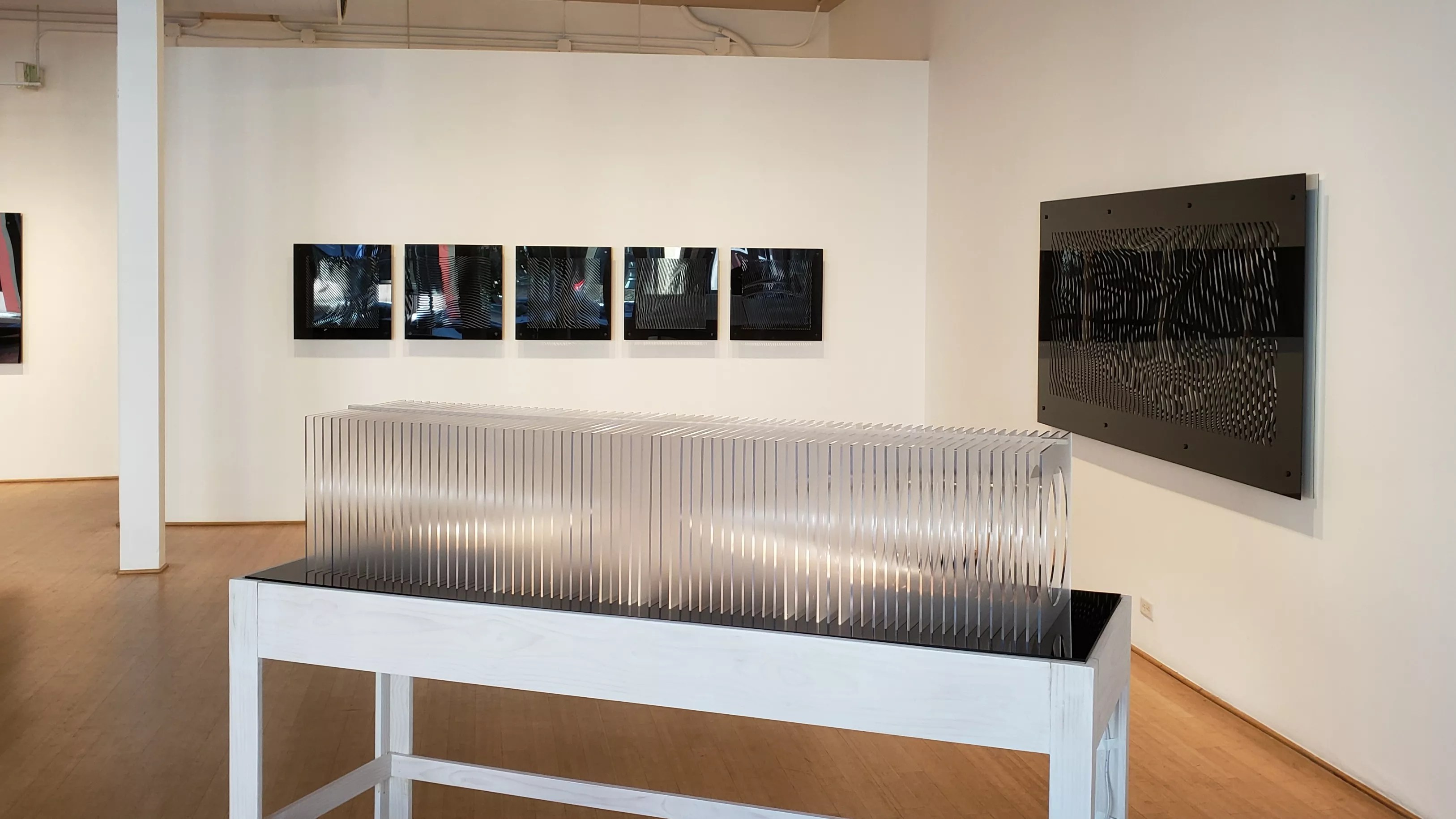 Interference opened less than two weeks later, with more than enough recent work to take over the entire front set of spaces. Most of the pieces are variations on a two-level op-art bas-relief that looks like a light box, a frequent form for Parson, but isn’t, since the only illumination is the ambient light of the room. For these, Parson has pierced a black screen with a linear composition and then mounted it out from a white field adorned with a composition that’s also black, like the screen. The wide space between the two components, along with the brightness of the white, provides just the right amount of light to reveal the moiré effect he wants, where the overlaid patterns seem to shift as the viewer walks by.