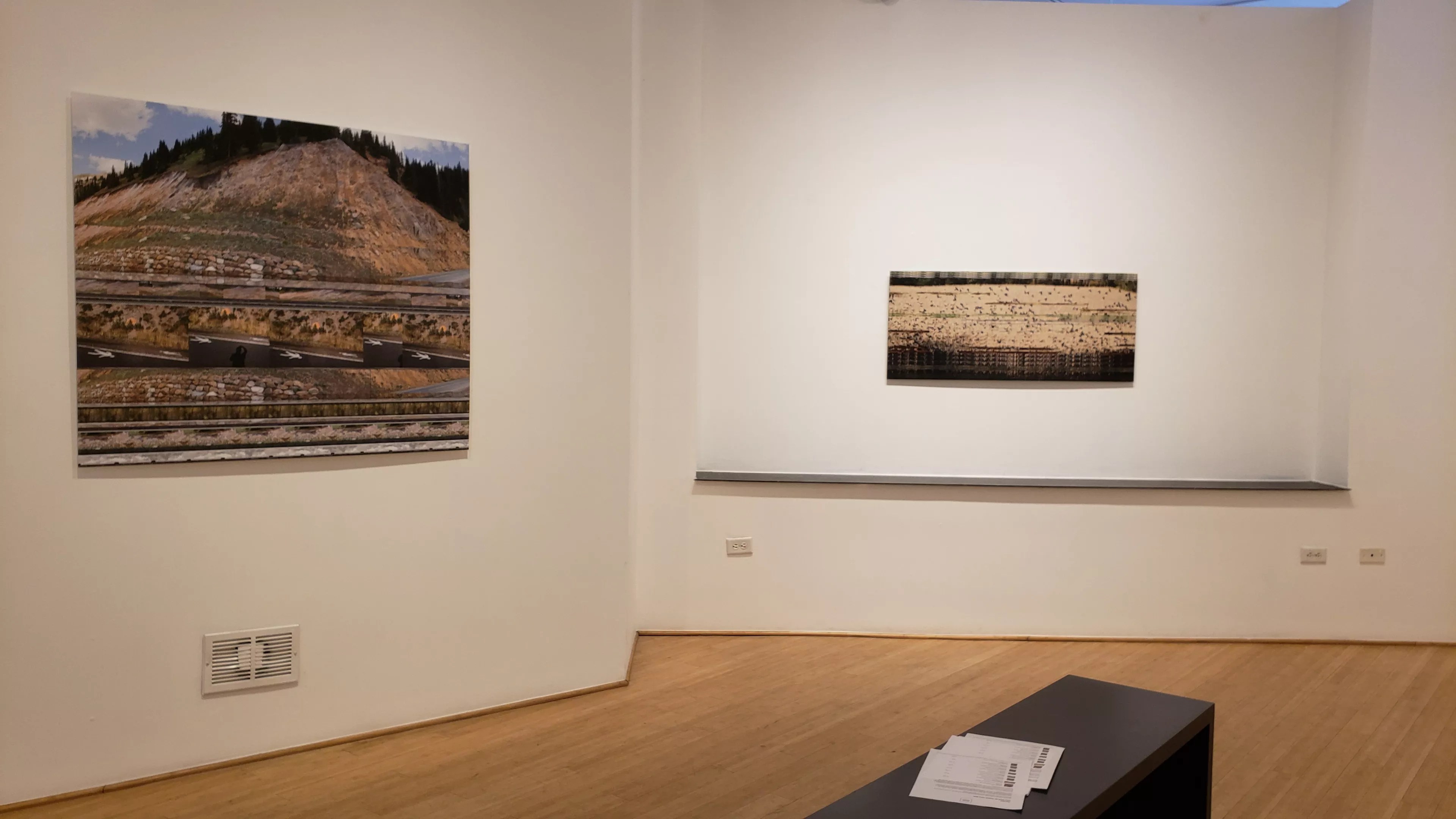 In the intimate back gallery at Michael Warren is a tight solo, Entropy: work by Angela Faris Belt, which comprises digitally altered photos by the Colorado artist. Though they’re all part of a series and share the same approach and the same subject – the landscape – they differ widely in appearance, largely because of their extremely varied palettes, more than anything else. But the process was not solely Belt’s: the AI of her computer incorrectly recovered her lost image files. In “Entropy_5883 (falling rock),” for instance, there is a large, heroic heroic image of a road cut, and then below it, the AI has inserted bands of other images, taken at the same site, depicting the weeds along the road or the road itself. These secondary images are repeated and tiled to form horizontal bars, and there are also added stripes of computer-generated static to further divide the piece. Somehow, despite all of these interventions, the work still functions as a traditional Western landscape, the road cut standing in for the mountains. With “Entropy_43222 (twin trees),” the recovery program added ghostly layers of images, lining them up horizontally, and non-naturalistic shades that are laid over photos via colored filters. Even so, this looks like a Western landscape, too.