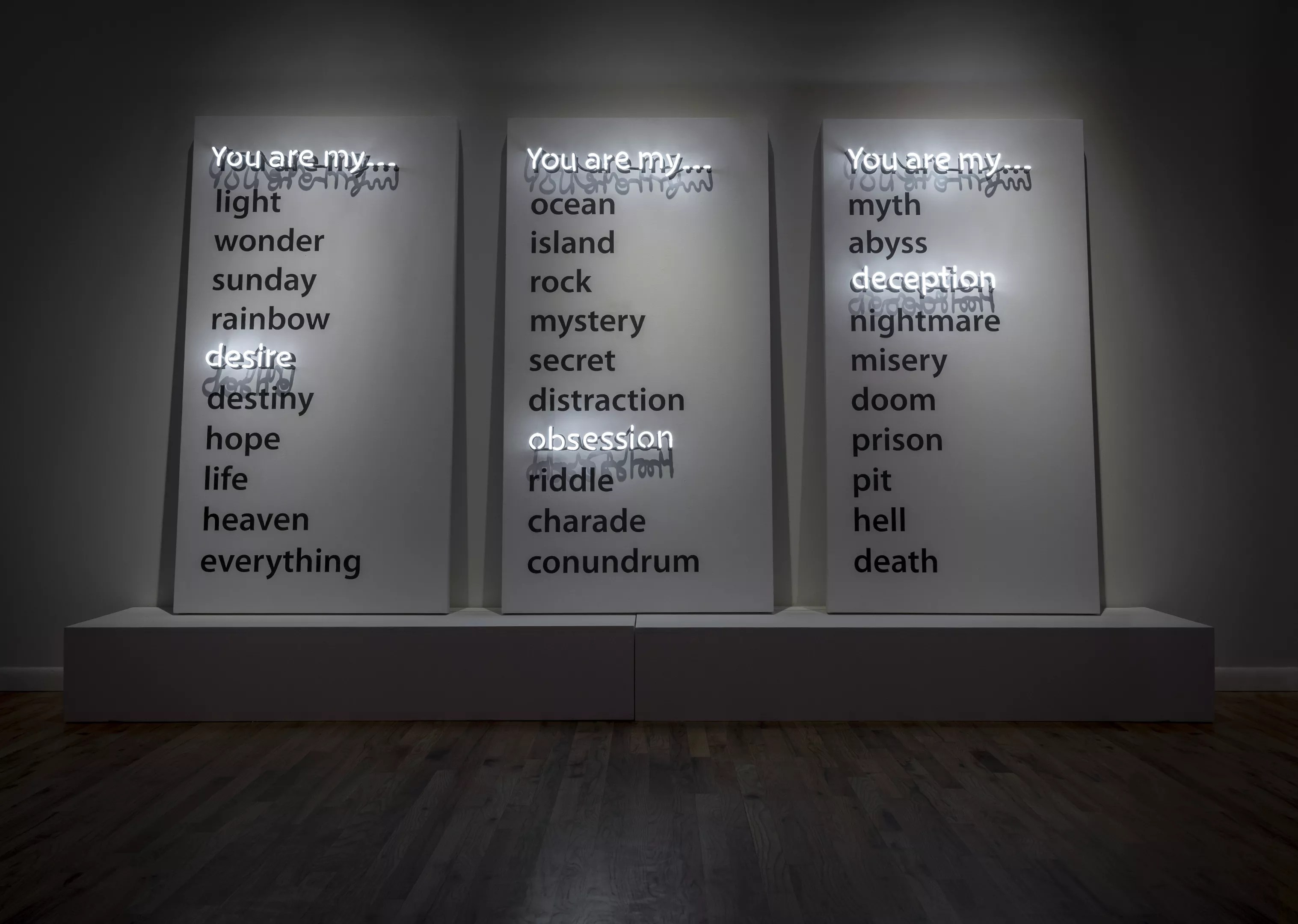 The third and final act, “Disillusion,” depicts the breakup with a group of light-colored panels from the “You Are My…” series. Young has printed words on each panel; the title and a single word below are lit up by neon. In the most down-hearted of the group, the printed words include “misery” and “doom,” while the lighted word is “deception.” On panels from another series, neon is used to cross out parts of yet more printed words. In “I Can’t Unlove You,” for instance, the “Un” is scribbled over with lighted tubes.