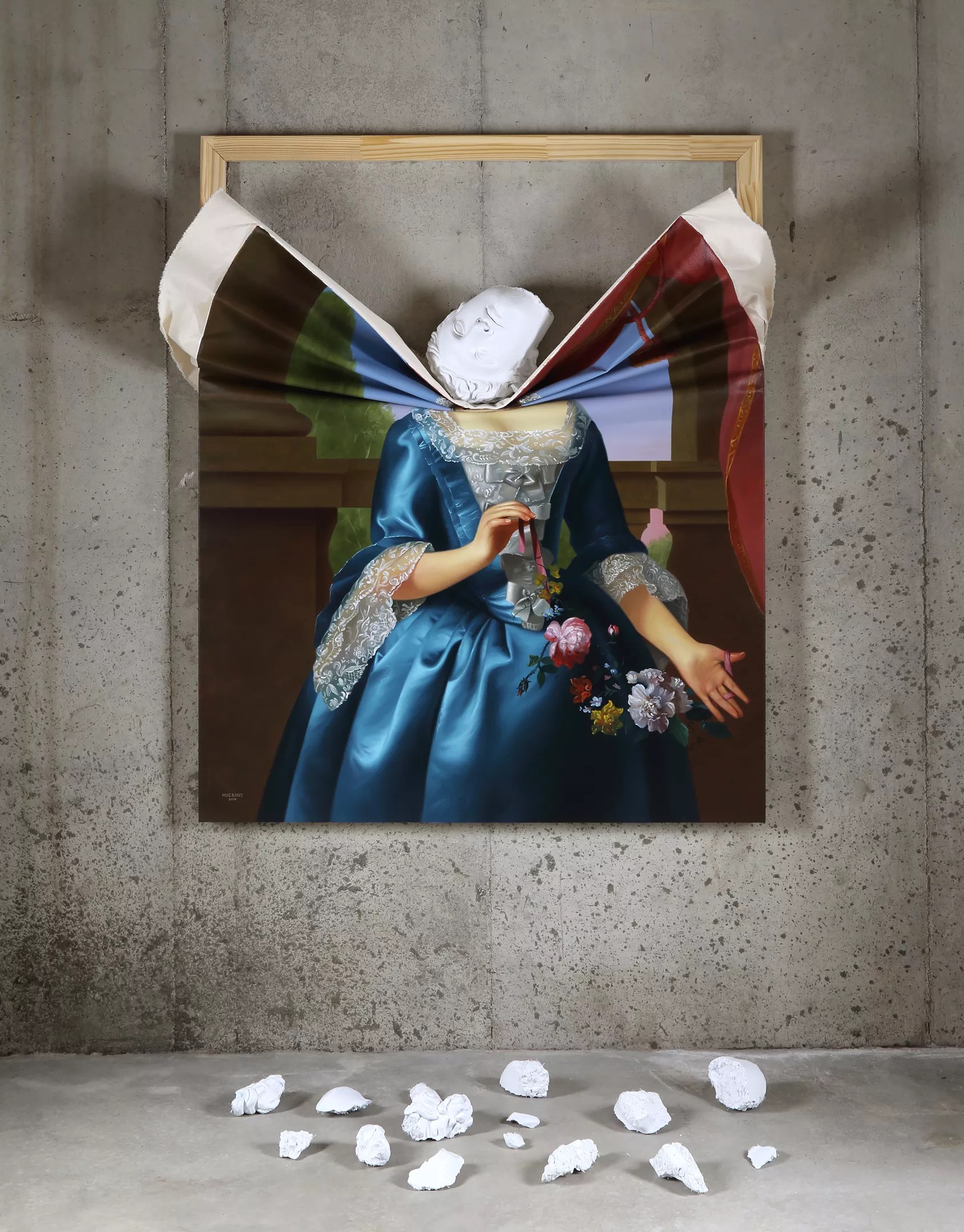 Adding structural elements to my work is a new process for me and was incredibly enjoyable. Up until this point in my career, I fell into the realm of just two-dimensional painting, so this new body of work was a fun challenge. I was looking to push myself into a new medium, and hopefully I will continue to incorporate sculptural elements into my work. The painting you are asking about is “Mrs. Anne Fairchild Bowler,” and was the very first painting I had the idea about for the show. The theme of the show is about a society’s immunity to destruction and extinction. I wanted to juxtapose this beautiful portrait of a woman of high status and have it cave and surrender to the weight of a fragmented three-dimensional Roman head…the fall from grace. I wanted to convey that no matter your status, once there are cracks in the foundation (foundation symbolized as the eighteenth-century American portraits from our nation’s beginning), then the remaining parts that make a society thrive start to suffer, and ultimately bring us to a colossal tipping point.