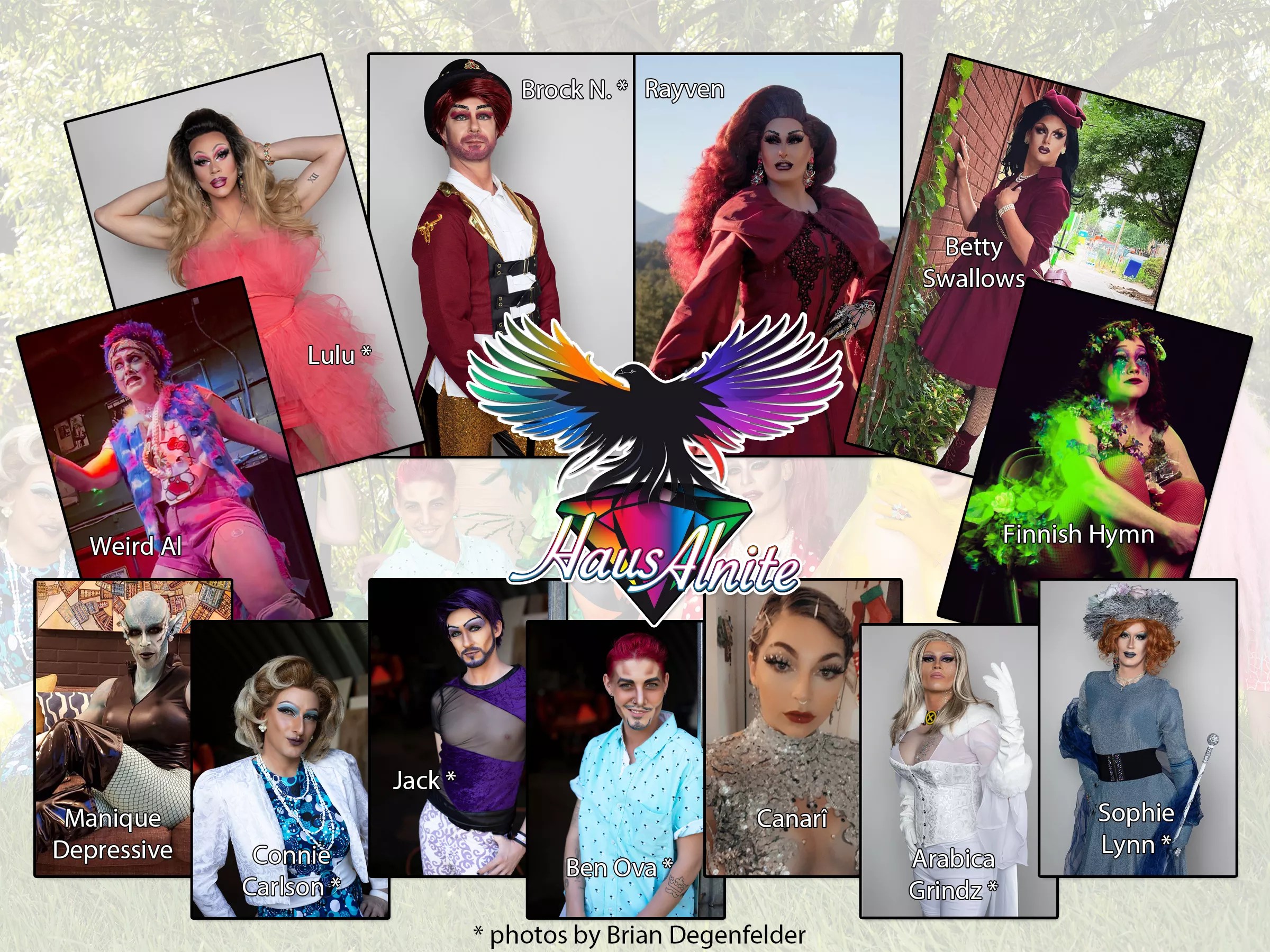 There are thirteen Alnites in total: Rayven, Brock N., Lulu, Sophie Lynn Shivers, Manique Depressive, Jack, Connie Carlson/Hoff, Ben Ova Bitch, Weird Al Spankabitch, Canari, Arabica Grindz and newest additions Finish Hymn and Betty Swallows. The diverse group of performers represents the full gender spectrum, with kings, queens and “quings” of all gender identities bearing the Alnite name. Haus Alnite is best known for elaborate full-family productions that revolve around a specific theme or narrative, such as its popular Drag Queen of Thrones show, which parodies Game of Thrones.