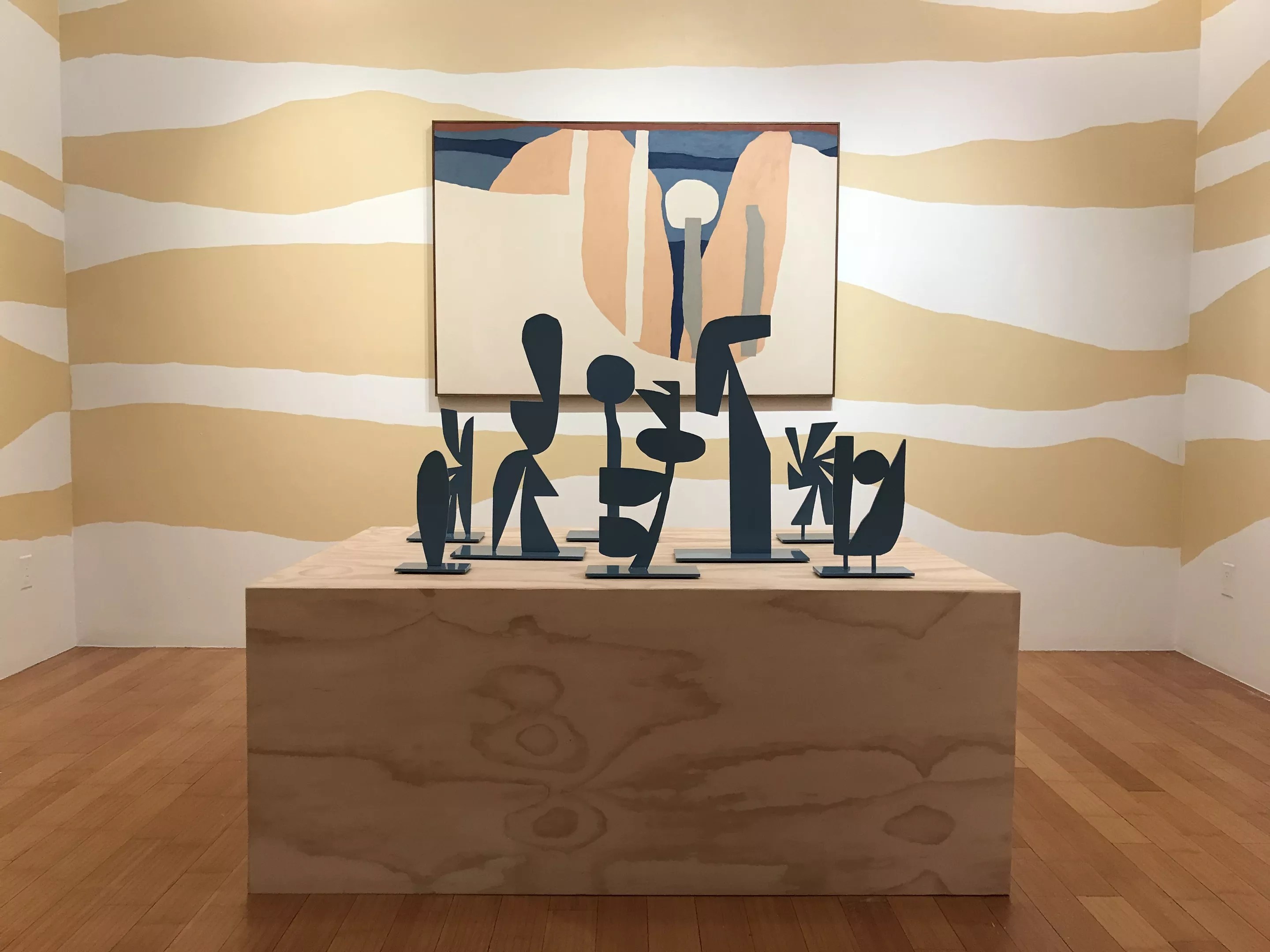 In the middle of the room is a low plywood plinth with a group of Hudson’s great little sculptures of the plants from the paintings on the walls. Formally, the plants are like those you’d see in The Flintstones, but they’re also kind of Matisse-ian. Interestingly, Hudson takes a more or less hard-edged view of his presumably soft-edged subjects. The three elements together – the wall painting, the paintings and the sculptures – transform the project space into a singular installation.