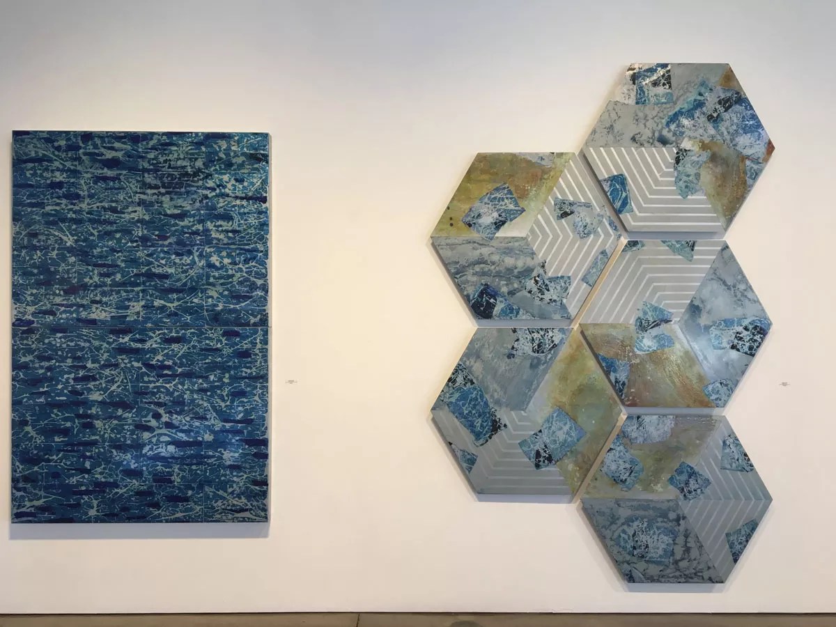 The sky and the sea are the images suggested by the non-objective paintings on steel by Denver’s Madeleine Dodge. The steel panels are mostly cut into rectangles, but also hexagons in a multi-part piece put together like a honeycomb. The surfaces of the paintings are scabrous, like oil floating in a puddle, as though the paints have chemically reacted to each other and to the steel. To get these effects, Dodge employs aluminum pigments and carbon transfers. Using the steel plates gives the paintings a sculptural minimalism, but the complex painted surfaces are very expressionistic, which fights against the less-is-more idea.
