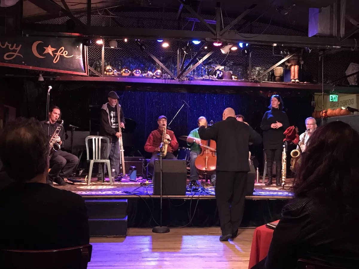 Steven Gordon (standing up with a homemade bass) and friends soundpainting at the American Gothic 2017 benefit concert.