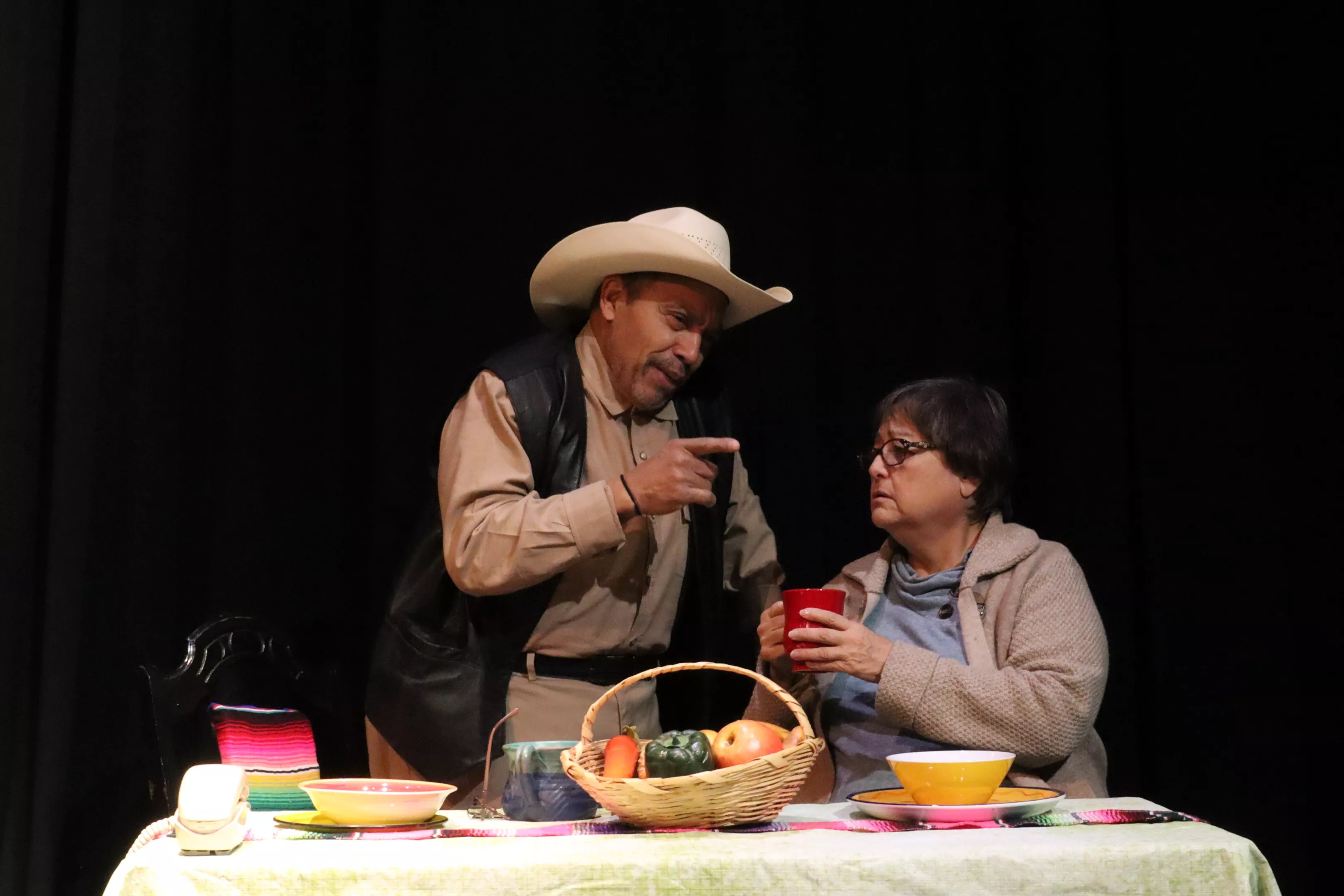Angel Mendez-Soto and Debra Gallegos sit around the table during a scene in Su Teatro’s El Esp
