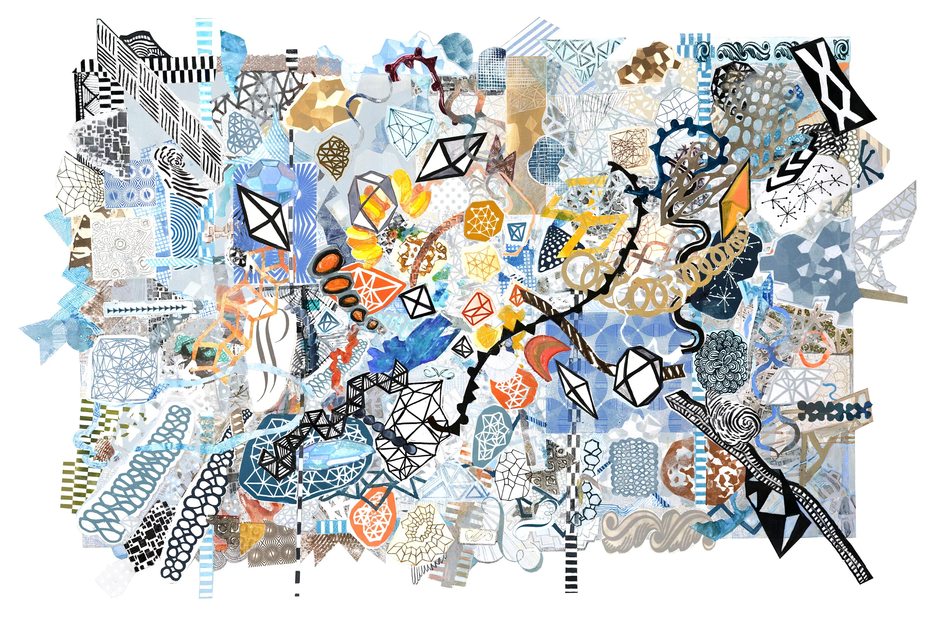 Both McLaughlin and Chandler stack images – one on top of another, and one next to another – until the entire picture plane is as full as possible. And that brings us to Diane Cionni, who specializes in works whose compositions are created out of colliding and overlapping patterns, both geometric, with linear solids like pyramids, and organic, like honeycombs. These patterns are individually articulated and come together to form the abstractions. An interesting feature of these works is the way Cionni has defined an inner framework within the pictures in which most of the visual material is held in check, but with a stray element violating it here and there. Cionni uses ink, polymers and copperplate printing to make these exquisitely crafted works on paper.
