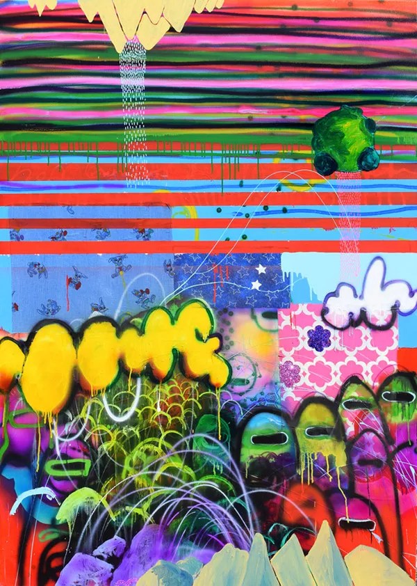 McLaughlin is known for densely composed nature-based abstractions made up of a riot of shapes inspired by plants, rocks, clouds and other natural objects and carried out in bold colors. All of these characteristics are in the political works, but he’s added some unexpected dystopian content. One such painting, “Field of Dreams,” is a take-off on the American flag, with stripes running across the top half and a grid of stars hanging below. But there are also passages that suggest urban grit, and, more pointedly, shapes evocative of members of the KKK. Even more surprising, coming from McLaughlin, are the grotesque masks he hung in association with the political paintings.