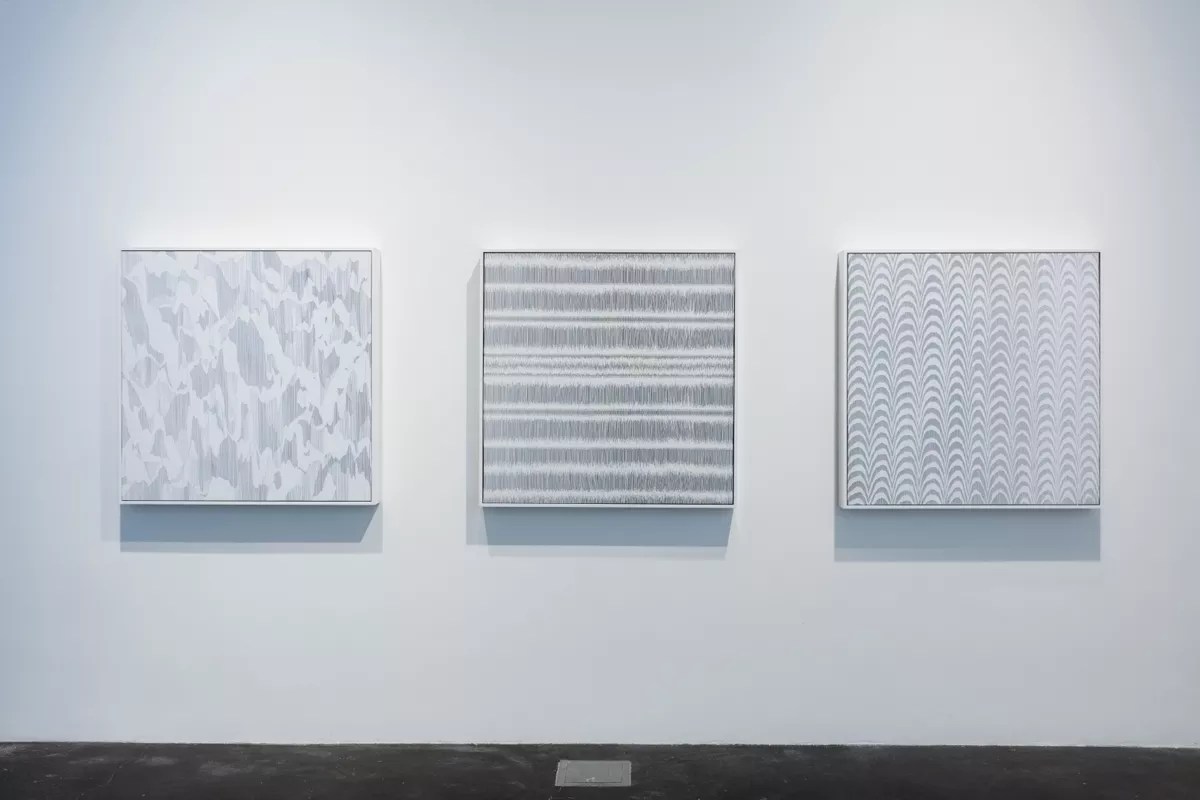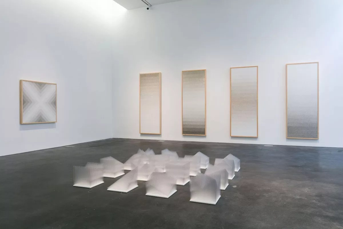 Installation view of Tara Donovan’s straight pin “drawings,” surrounding her transparent tube and Corian sculptures.