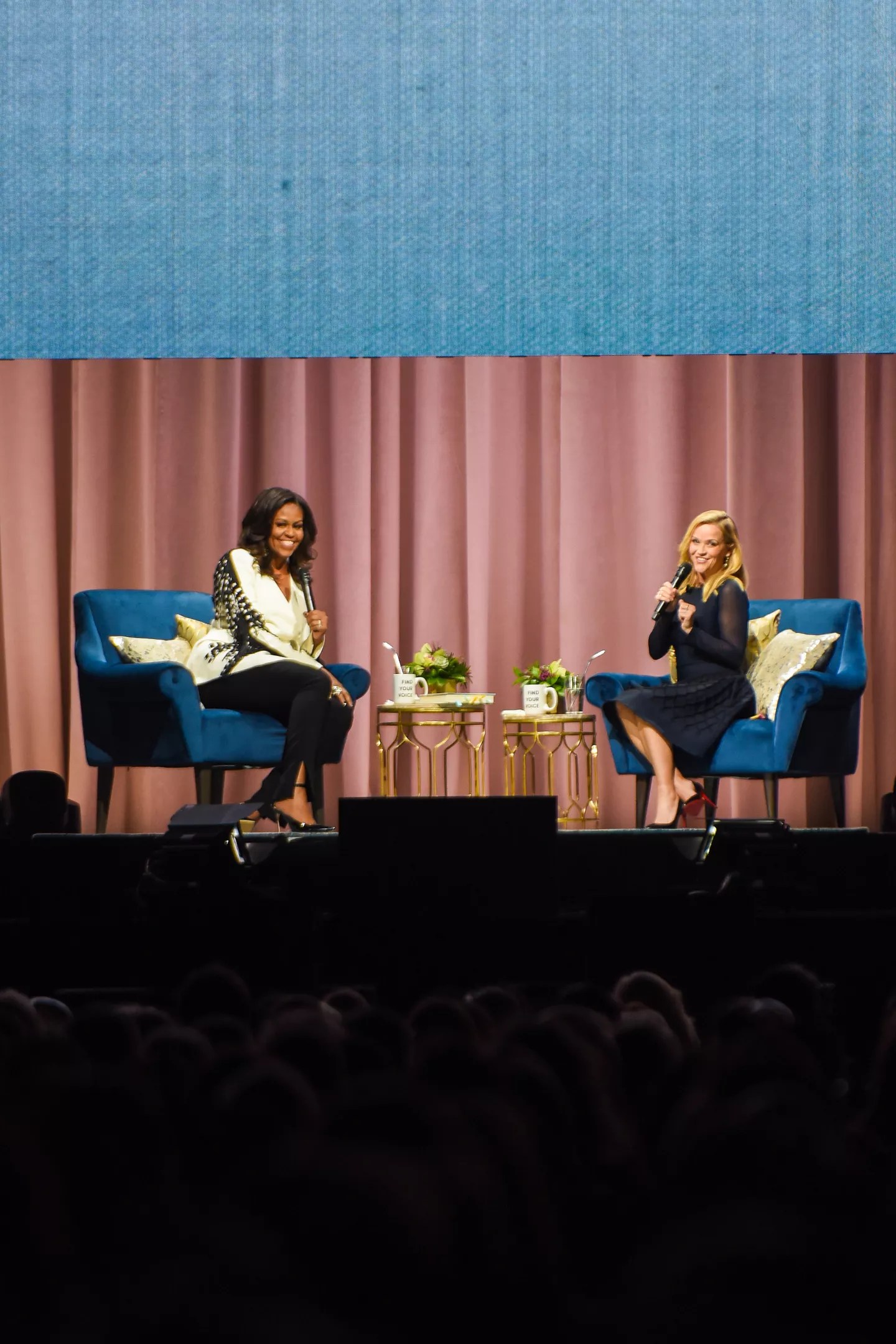 Reese Witherspoon asks Michelle Obama about the title of her book at the Pepsi Center on December 13, 2018.
