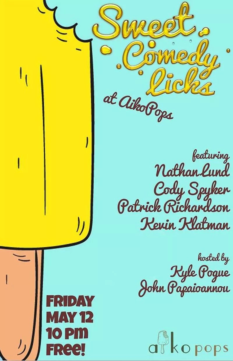 Despite the rainy skies above, summertime -season of patios and popsicles- is nearly upon us. What better way to herald the arrival of the new season than an al fresco comedy showcase specifically tailored for balmy summer nights? Sweet Comedy Licks, a new show from Kyle Pogue and John Papiaoannou, takes over the patio at Aiko Pops on Friday, May 12, with a fine inaugural lineup that includes Patrick Richardson, Cody Spyker, Kevin Klatman and headliner Nathan Lund. Guests can enjoy free beer and whatever an Aiko Shot is, and the shop will have popsicles and sandwiches for sale (cash only). Admission is free, but donations are always appreciated by perpetually broke comedians.