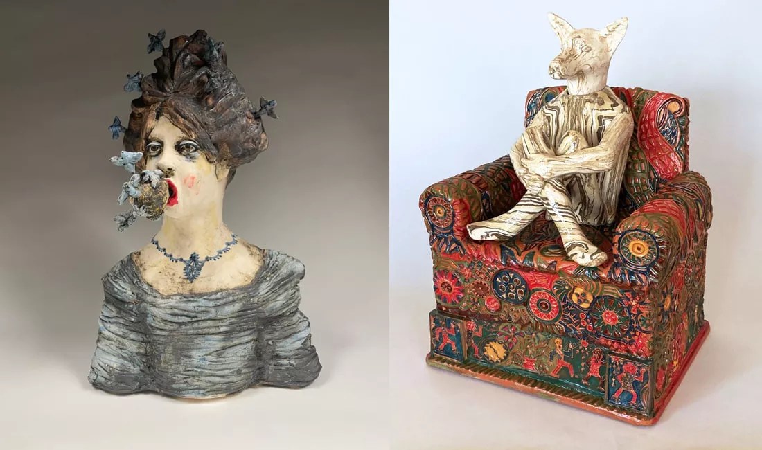 Penney Bidwell, “Diva,” 2023, ceramic, and Mike Keene, “Dog Takes My Seat.”