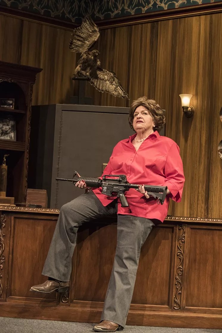 Yet somehow Schmidt managed to write a parody that’s funny without being preachy, blind, obvious or insensitive, and it’s being given a fine regional premiere by Curious Theatre Company. Ruby, the owner of a gun-manufacturing factory, is searching for a secretary, but the current applicant doesn’t seem suitable. She is April, a self-righteous gun-reform advocate who is also half-sister to office manager Janelle, fleeing an abusive husband and desperate for work. Eventually, however, the job goes to Lorrie, who clearly has a weird screw loose. As the action begins, there’s just been a shooting at the local school, where sweetly empathetic secretary Shirley shot an armed student. Which not only makes her a hero, but means that Ruby will see a huge upsurge in sales. Cheerfully, she comes out with a new weapon that she dubs The Secretary. But Brandy, mother of the slain student, doesn’t see things in quite the same cheerful light.
