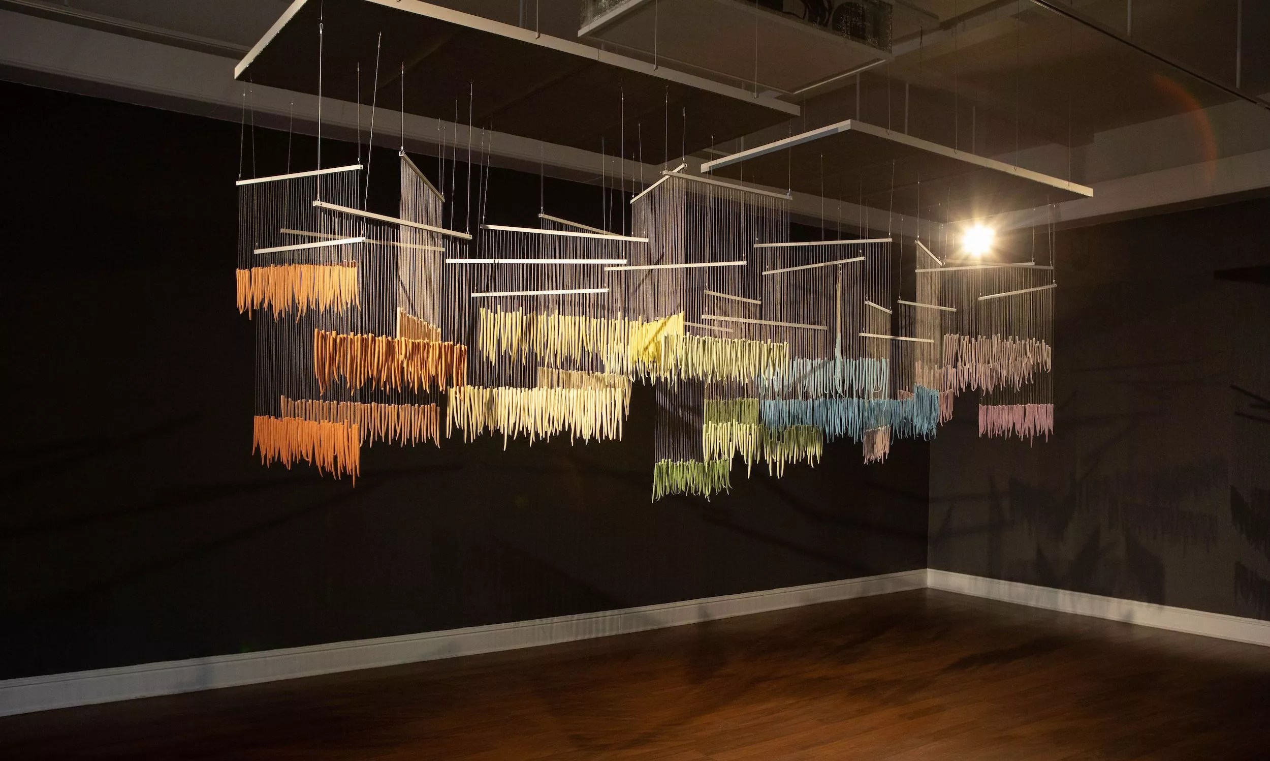 Jen Rose’s installation, suspended from the ceiling in shimmering layers, might remind you of piano strings floating in an ocean current. It’s not off-target at all to see it that way: Flight of the Polychromatic Zooids floats in tandem with a musical soundtrack from composer David Thompson, and is meant to resemble an underwater experience.