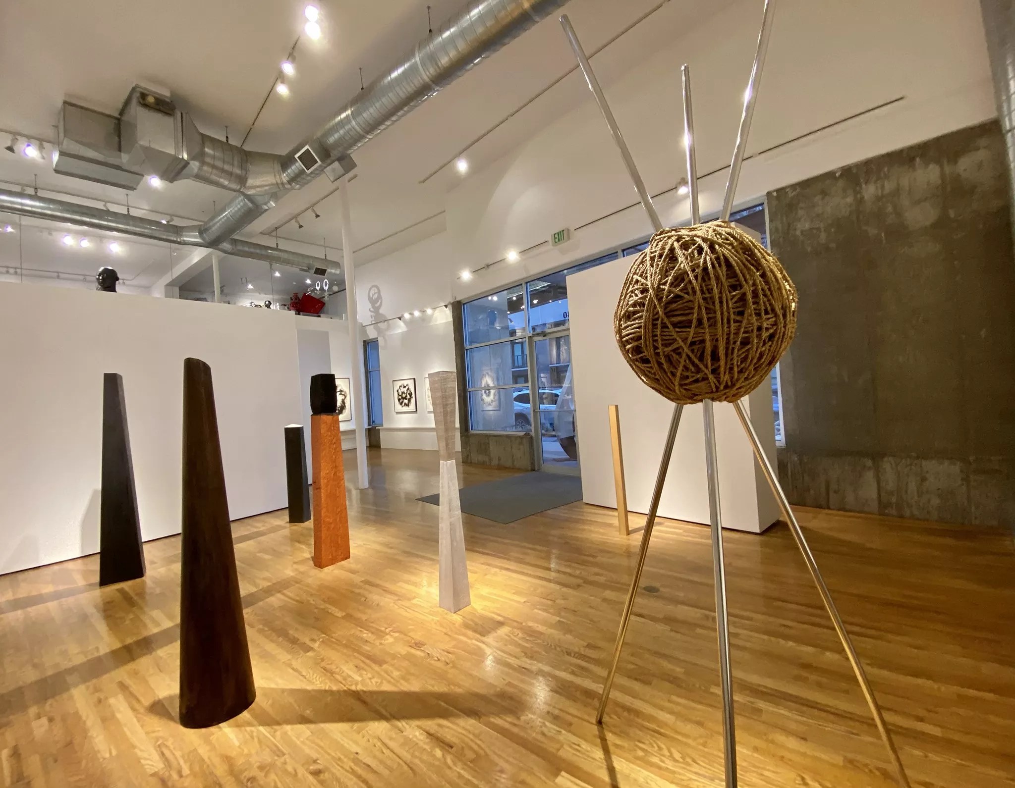 Arvada Center curator and gallery director Collin Parson delivers the second in what might become an ongoing series of exhibitions focused on artists working with specific materials (Paper.Works started everything in 2017). Wood.Works naturally showcases regional artists who primarily work with wood, and it’s quite a spread. Carley Warren: Three Pieces works as a companion show in the Theatre Gallery, telescoping in on the artist’s signature works, which always connect three wooden shapes at right angles.
