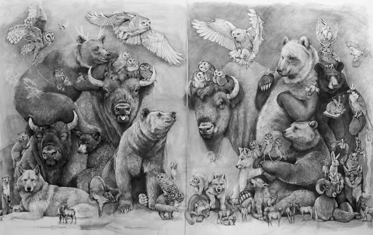 Adonna Khare, “Bison & Bears,” 2020, carbon pencil on paper.