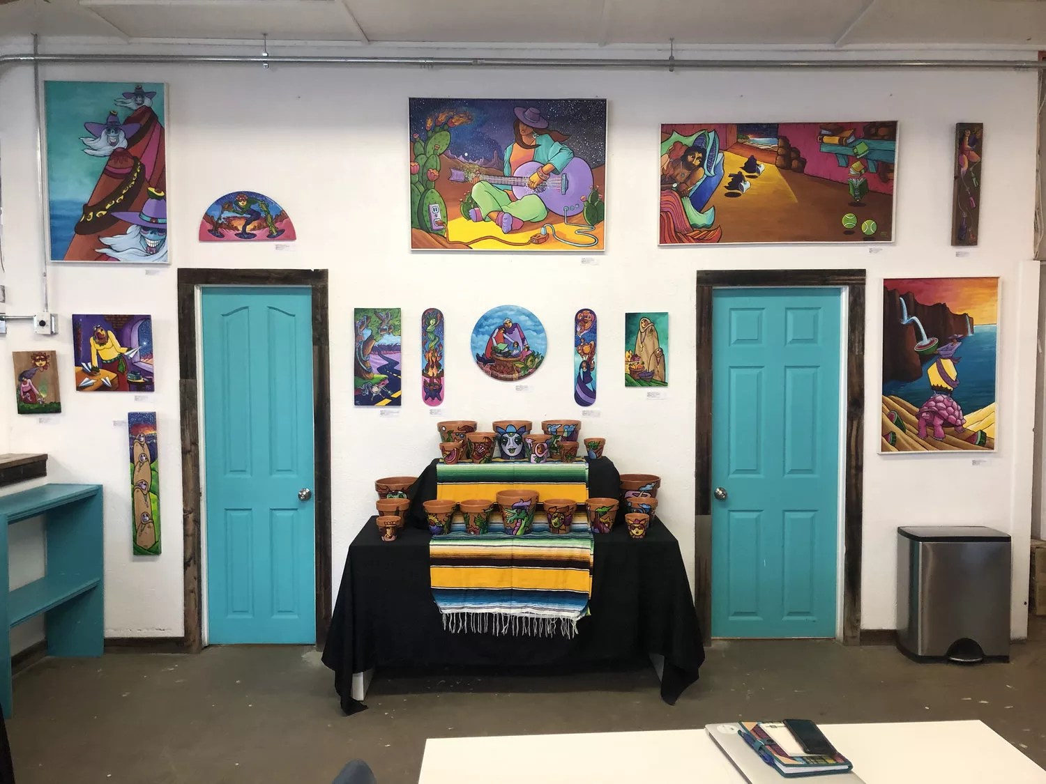 Daniel Luna has his paintings and flowerpots ready for buying at the Westwood Food Co-op.