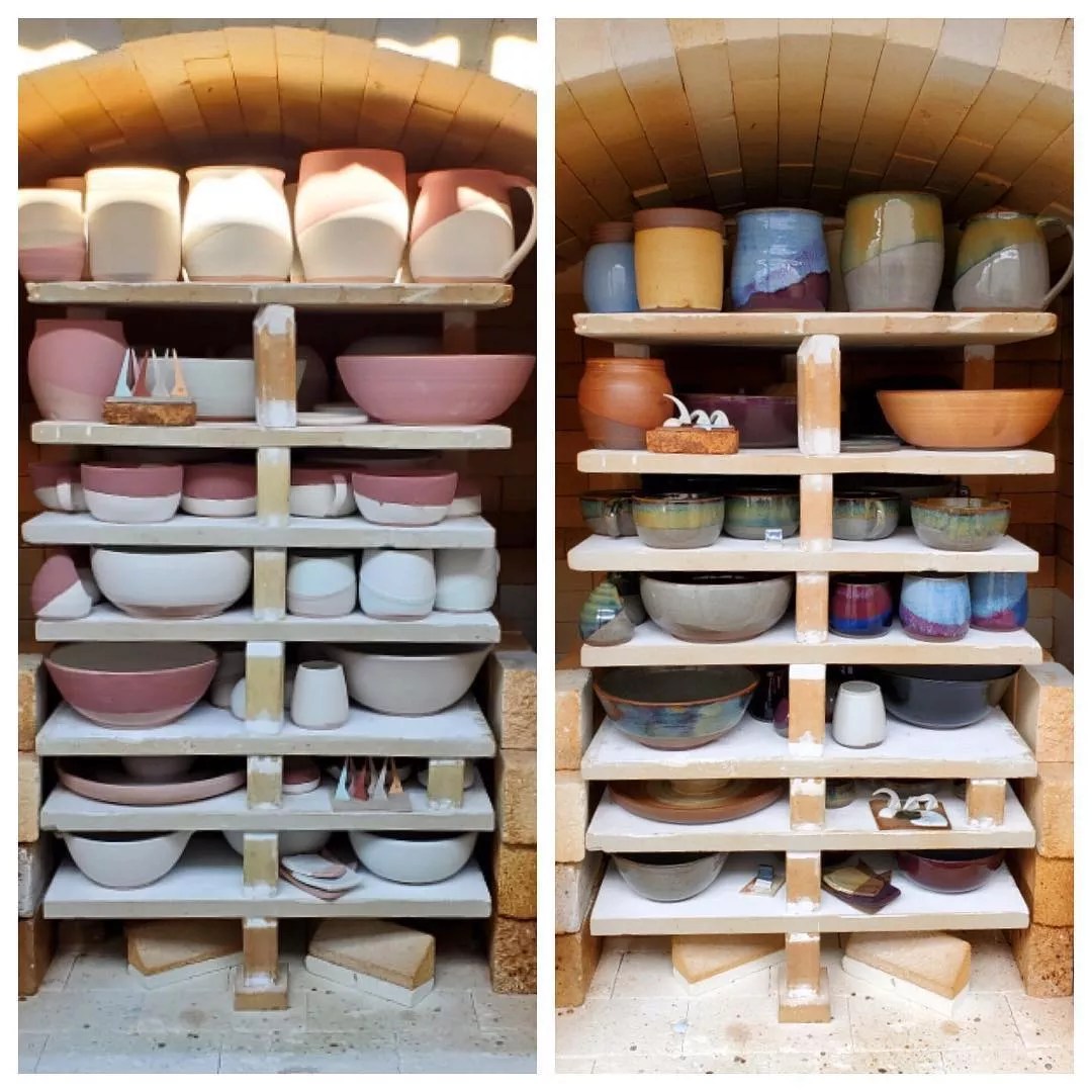 Ceramics by Emilia Broadhurst Ealom, before and after firing.