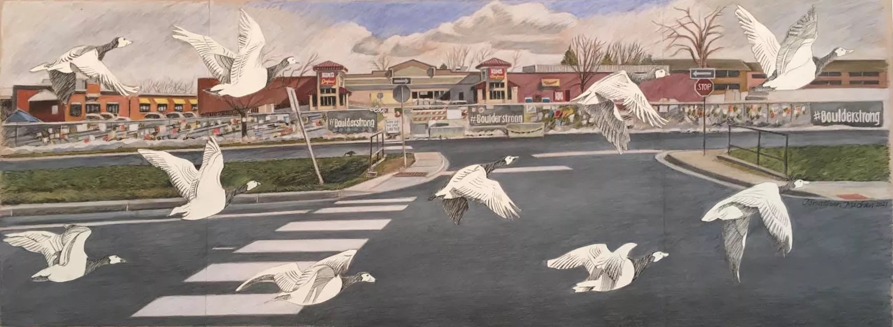 Eleven artists, including ESAC founder Giuseppe Palumbo and other center studio-mates, will honor victims of gun violence, including the ten lives lost in the March 22 Boulder King Soopers shooting, with Cracked, an art show mounted in solidarity and delivered with an anti-gun message. ESAC invites the grieving Boulder community – and everyone else – to the opening to enjoy live yoga and music by Kal and Elin. The gallery is open by appointment only after opening weekend (303-378-0454, gallerygiuseppe@gmail.com).