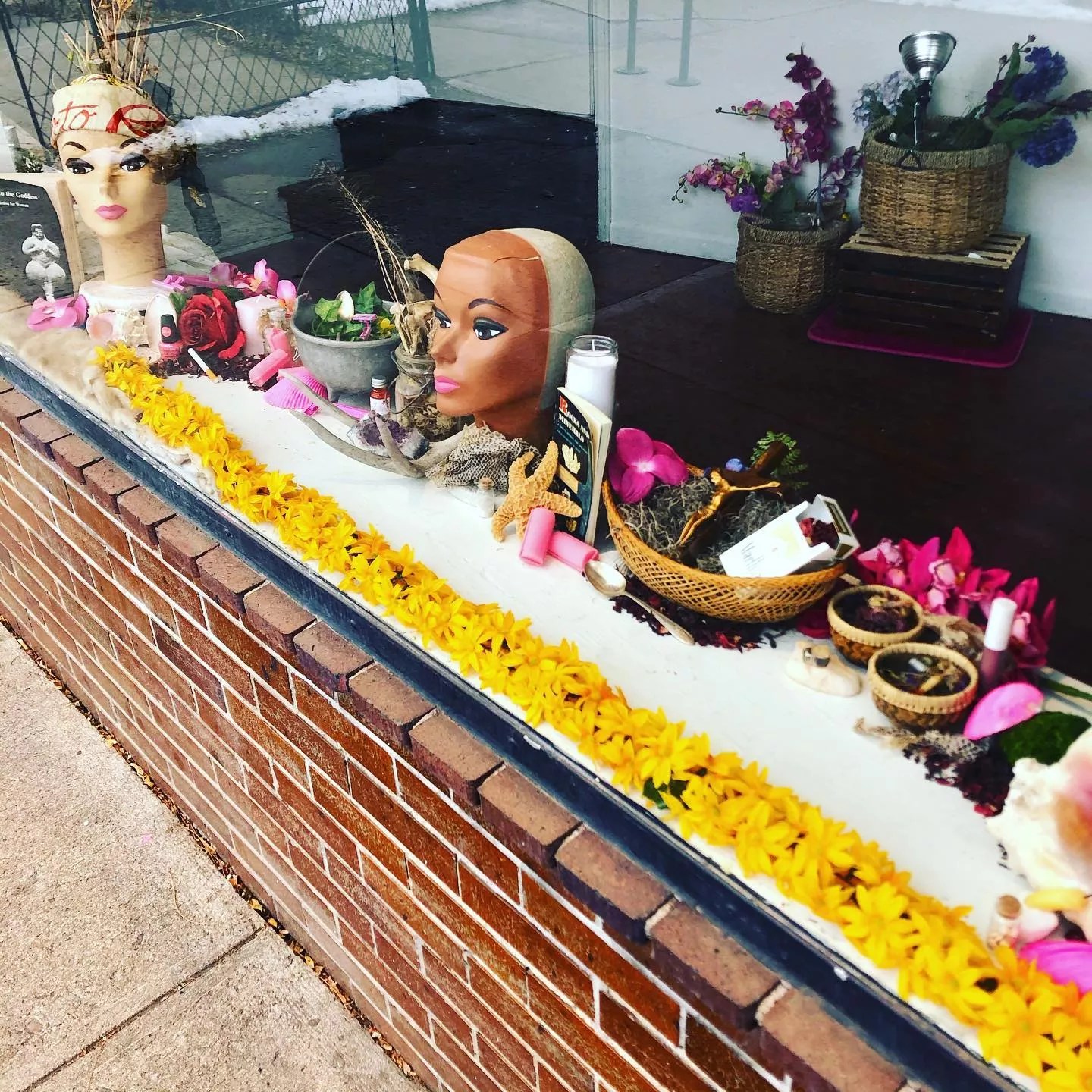 Another of Denver’s display-window galleries, the Storeroom, the empty storefront next to the Vine Street Pub, is showcasing Jasmine Dillavou’s new installation, Portal Brujeria, a re-creation of an occult botánica window that serves as an altar to a fictional Holy Mamacita. Drive by and check it out 24/7 from your car or on the sidewalk.