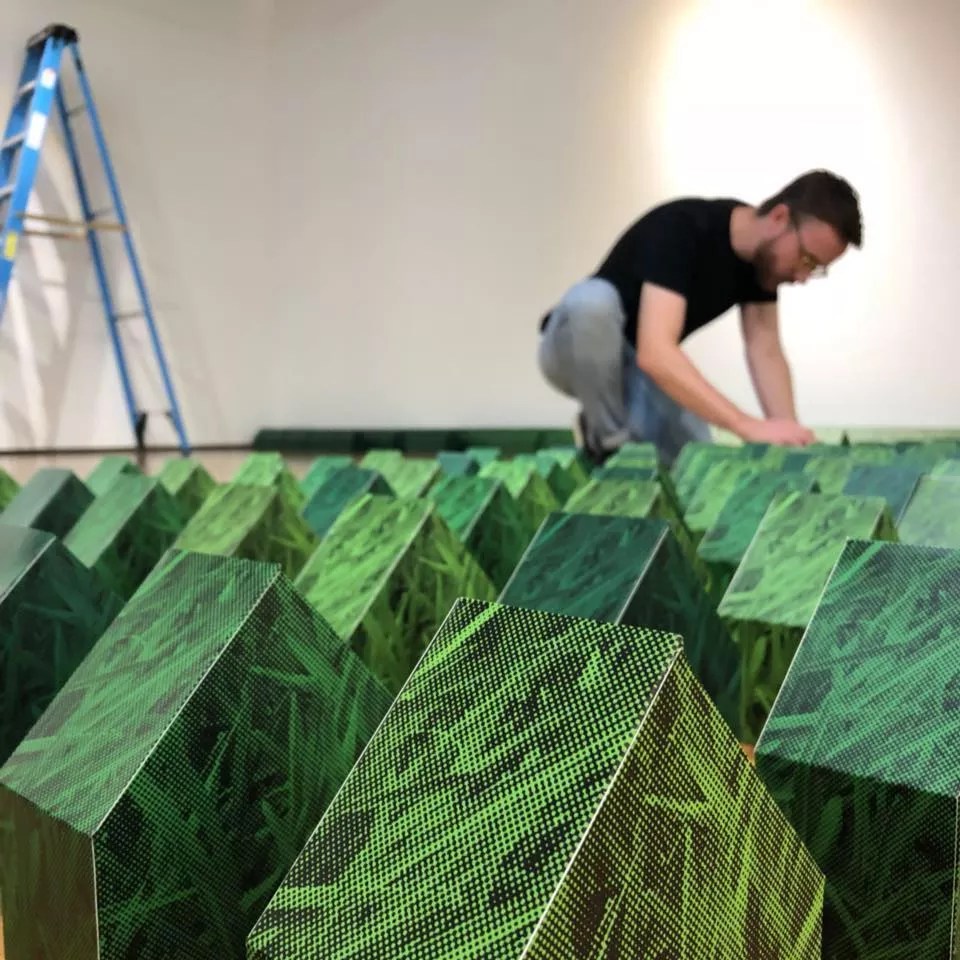 A RedLine resident with a practice blending book arts, printmaking, sculpture and conceptual art, Canadian artist Mackenzie Browning built an installation story about the encroachment of ubiquitous structures in modern life for Green Screen, using screen-printed folded- and cut-paper constructions. Surround yourself in Browning’s greenery in Greeley, and while you’re on campus, check out another opening: Agnes Ma: Please, Stay on the Trail, in the Oak Room Gallery at Crabbe Hall.