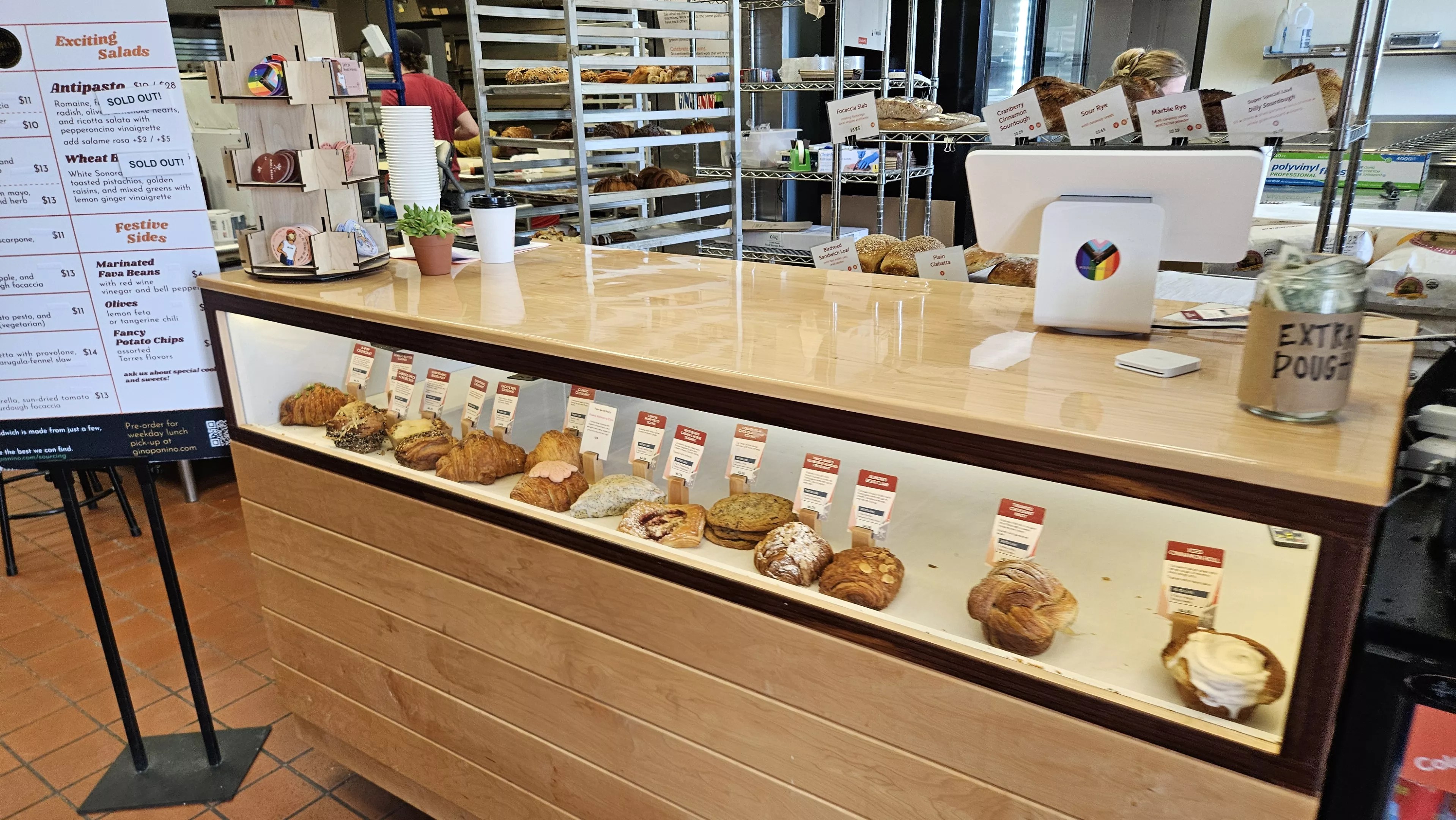 Rebel Bread has racks of baked goods everywhere and a display of fresh-baked pastries and bagels.