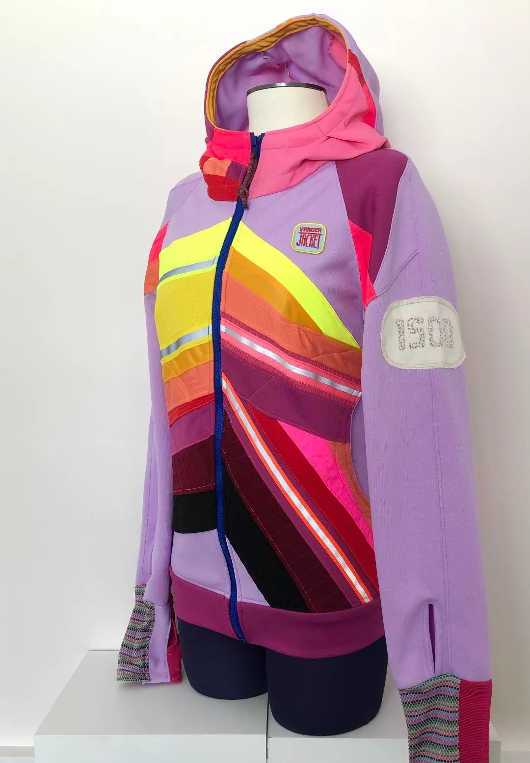 Vander Jacket currently carries women’s and men’s one-of-a-kind jackets and micro-lines of jacket designs in various sizes as well as windbreakers, runners’ tanks, balaclavas and hats; a vest collection will debut in May. The brand has become Vander Neut’s full-time job, and she is proud of the team of diverse women who help her make the line.