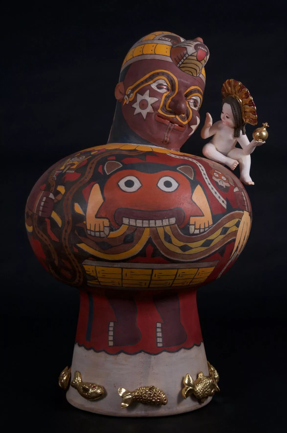 Kukuli Velarde, “San Cristóbal,” 2012, low fire clay, underglazes, casein paint, gold leaf, gold luster. Inspired by work from the Nazca culture (Peru).