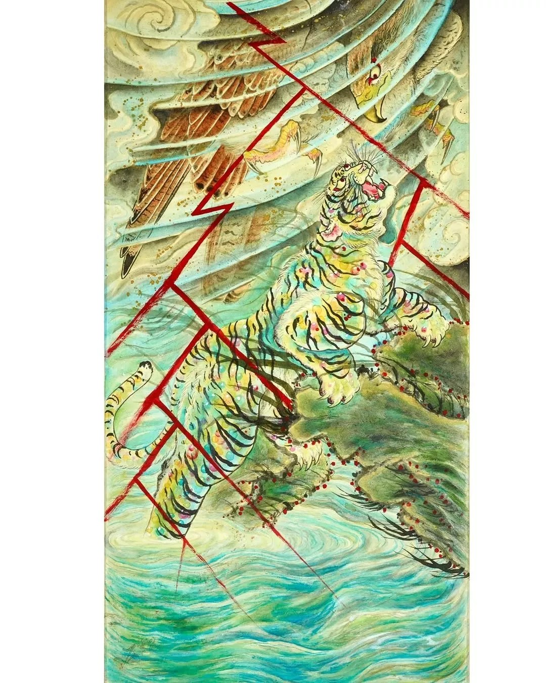 Between a tiger and a hawk is a bolt of lightning red as rage, electrifying the water.