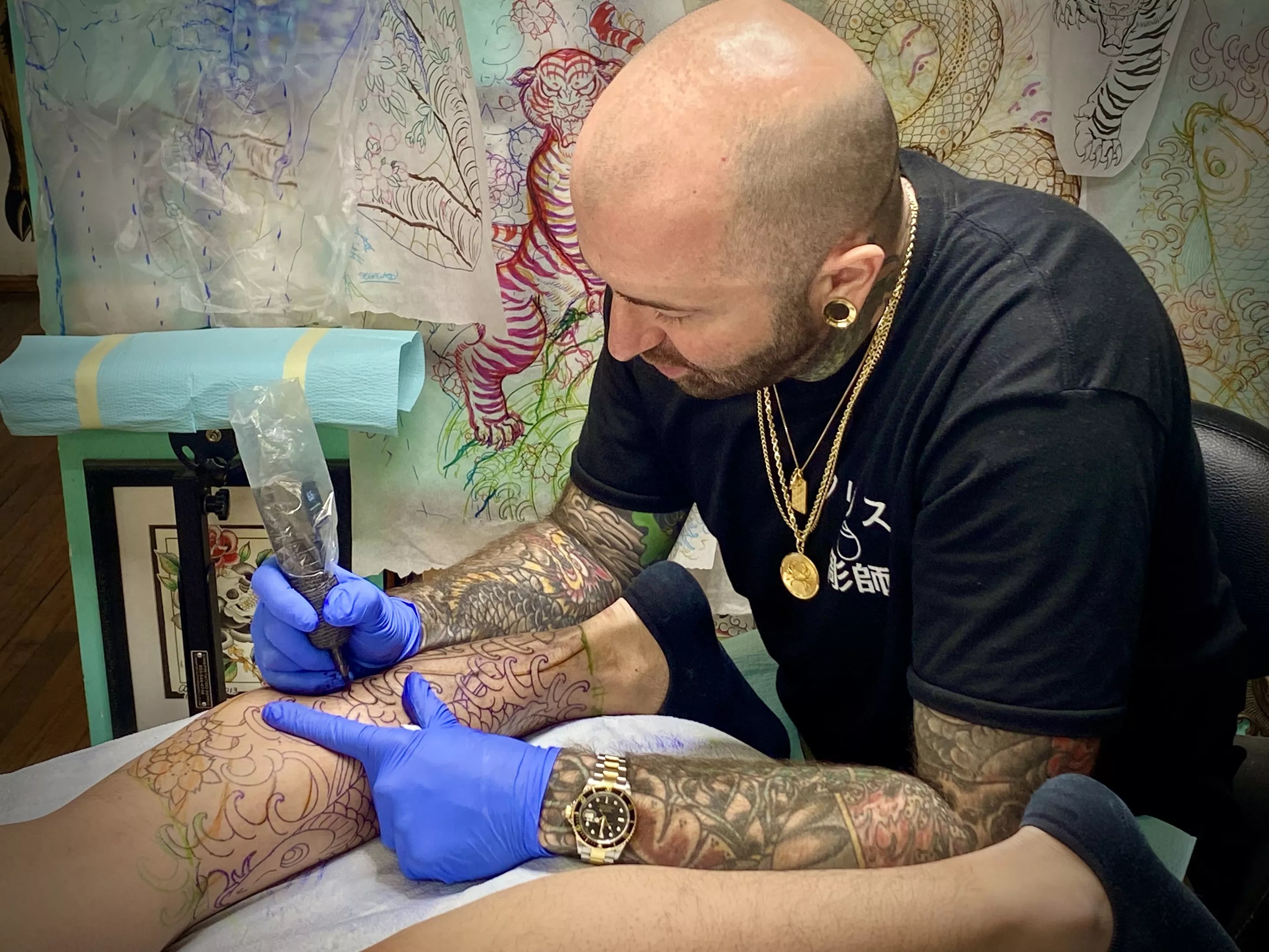 Of the figures people get tattooed, he mentions warriors, tigers, angels (karyÅbinga), and various creatures of heaven and hell. However, amongst an expanse of options, he admits his niche. “A lot of my specialties are tigers, dragons, hawks, occasionally warriors… A lot of people say that tigers are my specialty.”