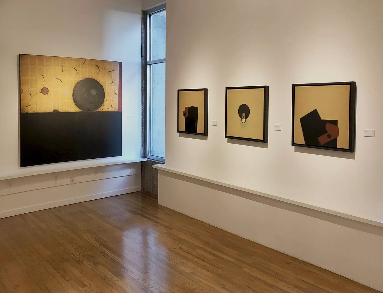 “Looking at it all together, I can see that I’ve used the same forms, like circles, over and over,” he notes. While that’s true, every time he goes to the creativity well, he manages to pull up a new formulation of the same idea, orchestrating various geometric shapes – not just circles, but lines, bars, rectangles and squares – to make his atmospheric paintings, collages, prints and constructions. Not everything is dark, but Lobato prefers deep colors, in particular black and red, so a lot of the paintings have a contemplative quality, if not a moodiness. Also noteworthy is his use of book pages and covers as elements in both his collages and constructions.