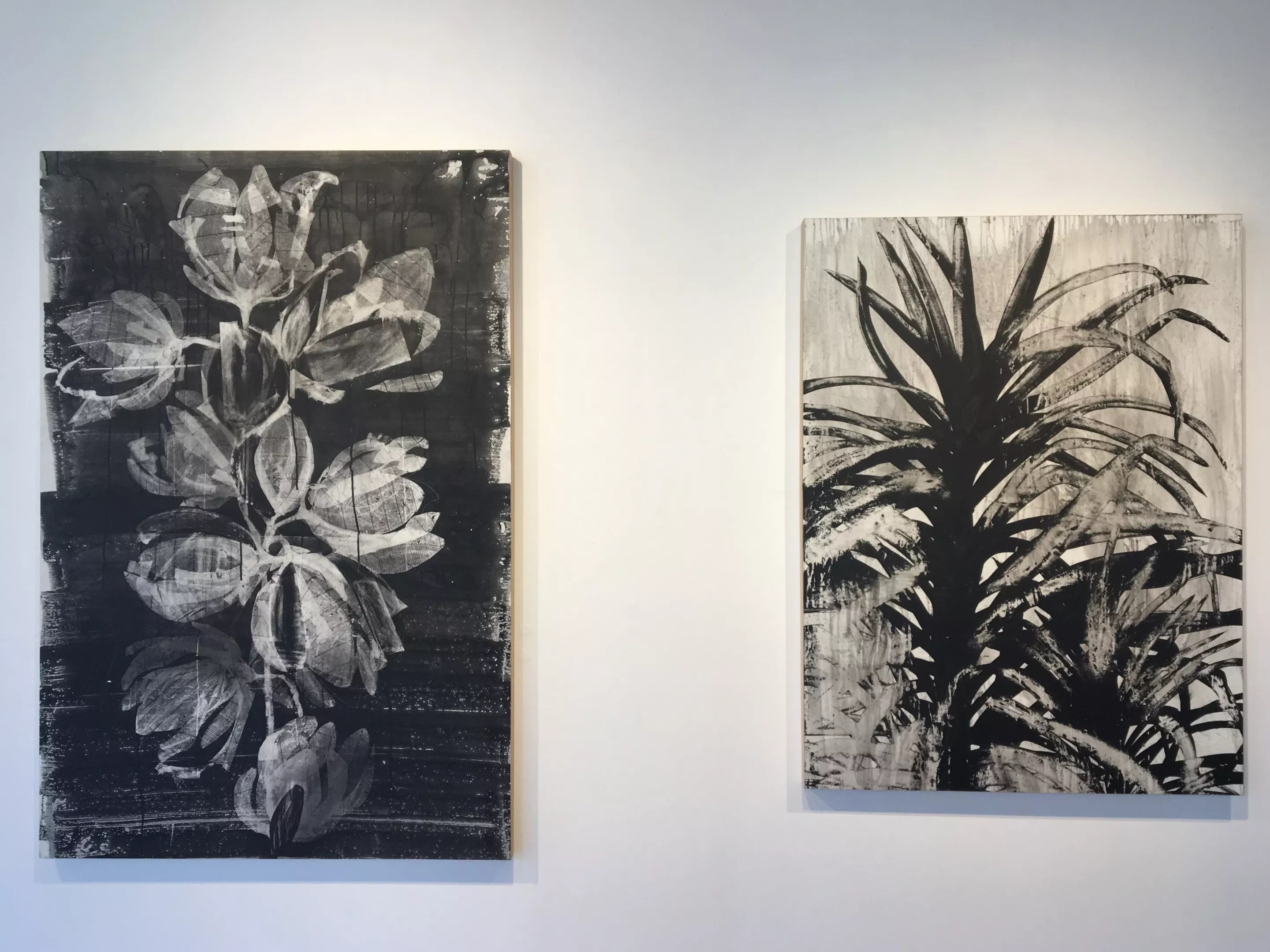 Jung spent the better part of a year creating this new body of work, sparked by a visit to the Royal Botanic Gardens, Kew in London back in January. The drawings are mostly oversized renderings of plants and flowers done in sumi ink and charcoal on sheets of Mylar laid flat on wooden panels, and fixed with an inviable sealant. This approach to presentation is markedly different from the typical way that drawings are shown, which is behind glass and framed; the unorthodox tactic allows Jung’s drawings to function as substitutes for painting, seen unframed and without glass.