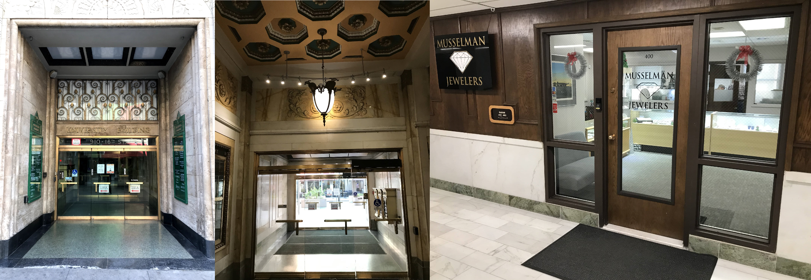 The exterior and lobby of the University Building, and Musselman Jewelers on the 4th Floor