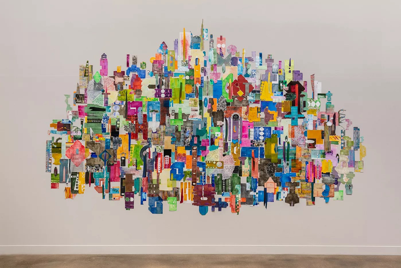 Wall collage of prints and ephemera by Susan Oehme in 528.0.
