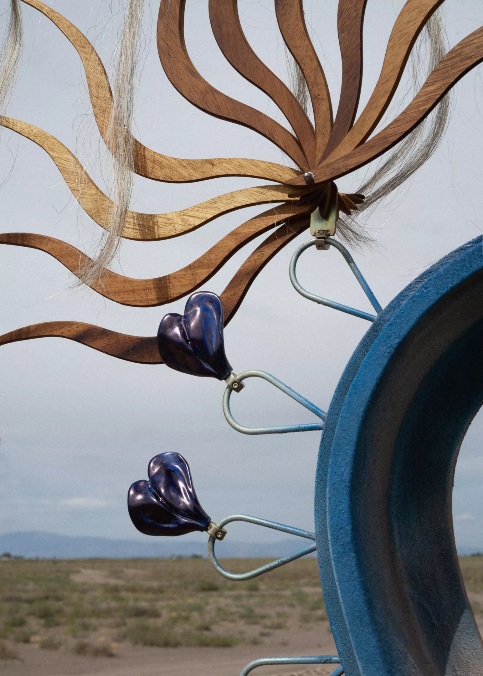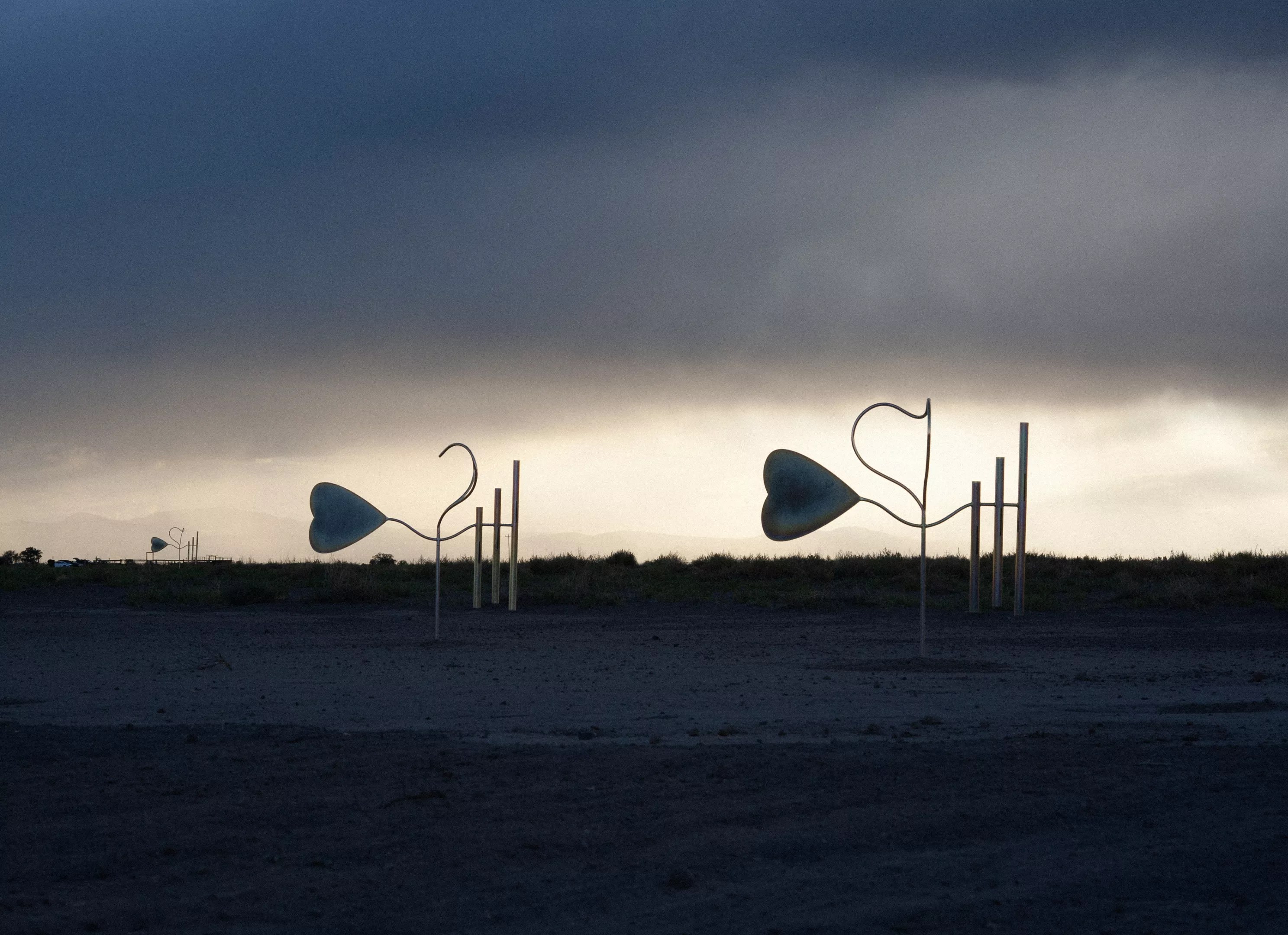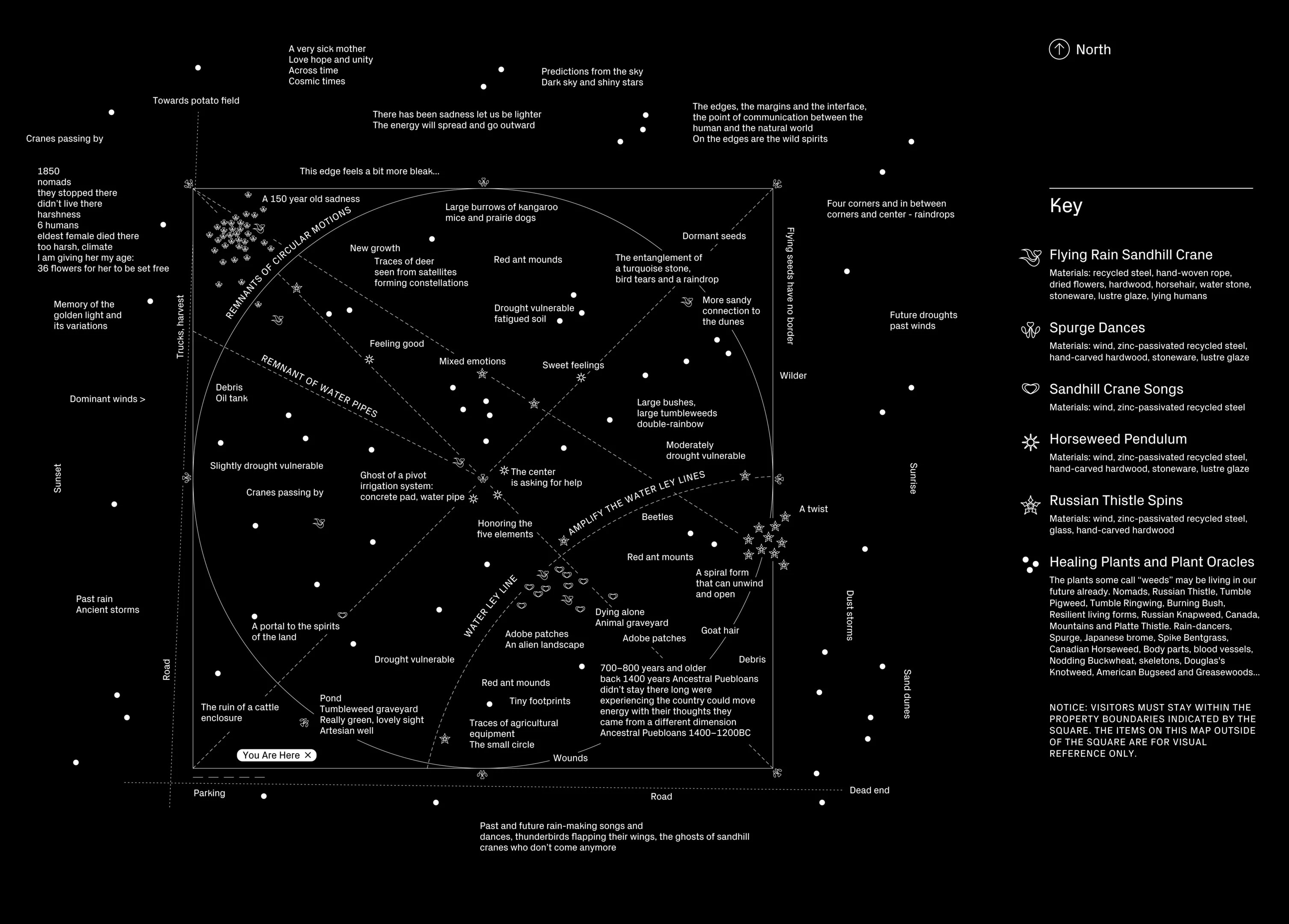 In contrast, the 77 kinetic, small-scale interactive sculptures, called “divination instruments,” twist and whistle in the dry winds that notably also carry volunteer seeds across the land to sprout nomadic vegetation new to the area. Humeau likens them to acupuncture needles, “aiding the release of restorative energies and histories,” Stell says.