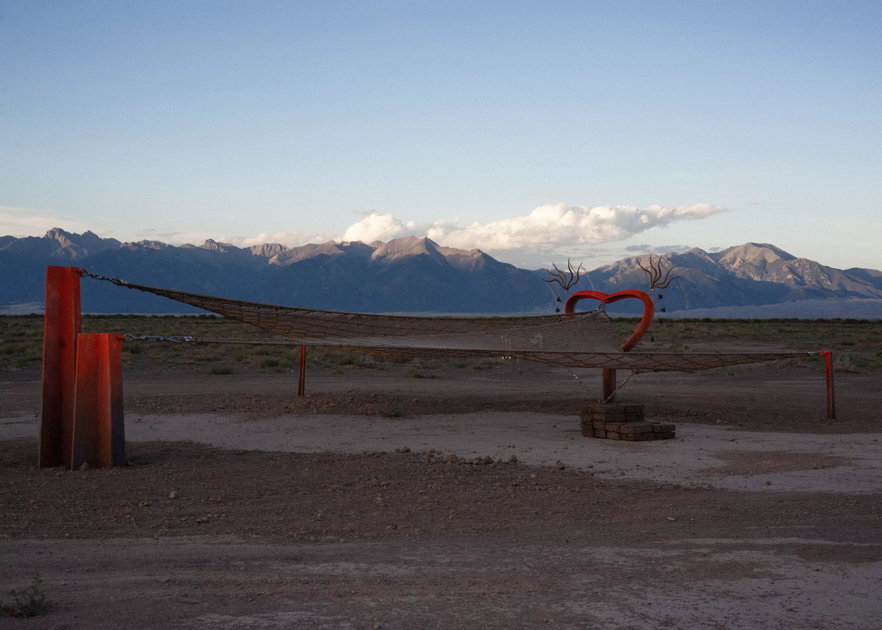 There are two categories of sculptures. Seven are large-scale, abstract sandhill cranes in flight with interactive net wings that people can climb into to rest and merge with the landscape. Each massive bird, approximately thirty feet in length, is unique. The sandhill cranes, who nest near Monte Vista, have been migrating through the area since prehistory, Stell notes. “But now the wetlands are changing.” One day the majestic migrants could be a thing of the past in Colorado.