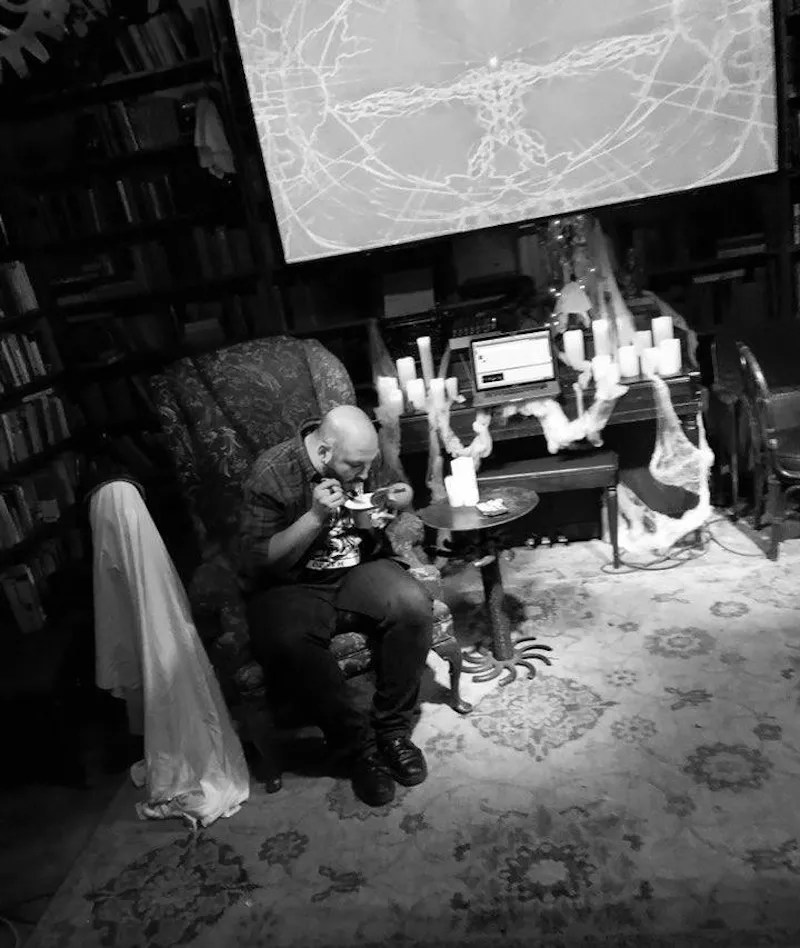 Maiurro eating cheap ramen at Mutiny Information Cafe after the inaugural South Broadway Ghost Society event in November 2018.