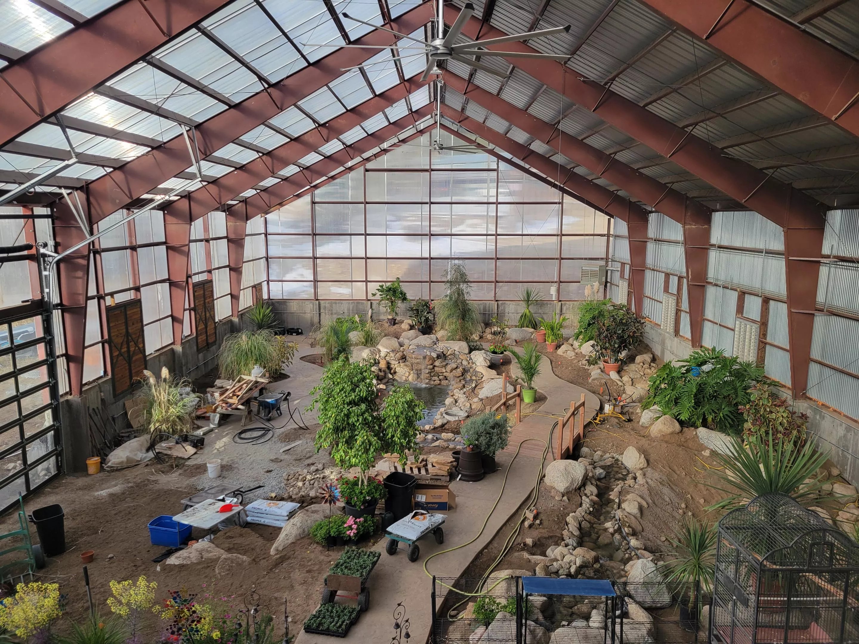 “Originally, the pools were going to be indoors,” Merrifield says. “They were going to be more like a rec pool.” To utilize the large 60-by-140-foot structure built under the initial plan, he installed a polycarbonate greenhouse covering and converted it into a botanical garden.