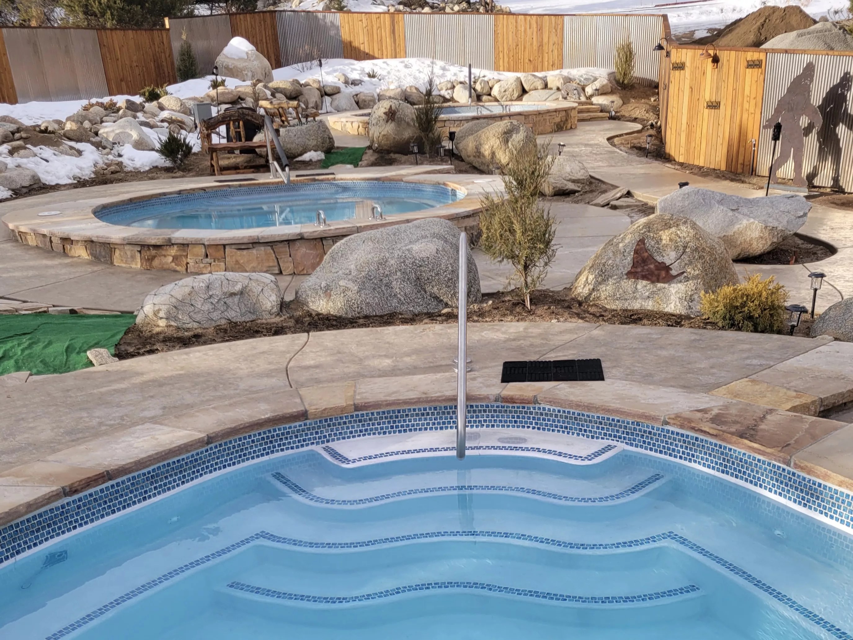 The venue is relatively small, as are the pools, which range from around twelve by twelve feet to sixteen by sixteen feet. Pathways up to the pools are all handicapped-accessible, and although a privacy fence wraps around the soaking area, it doesn’t block the views of the surrounding mountains and national forest.