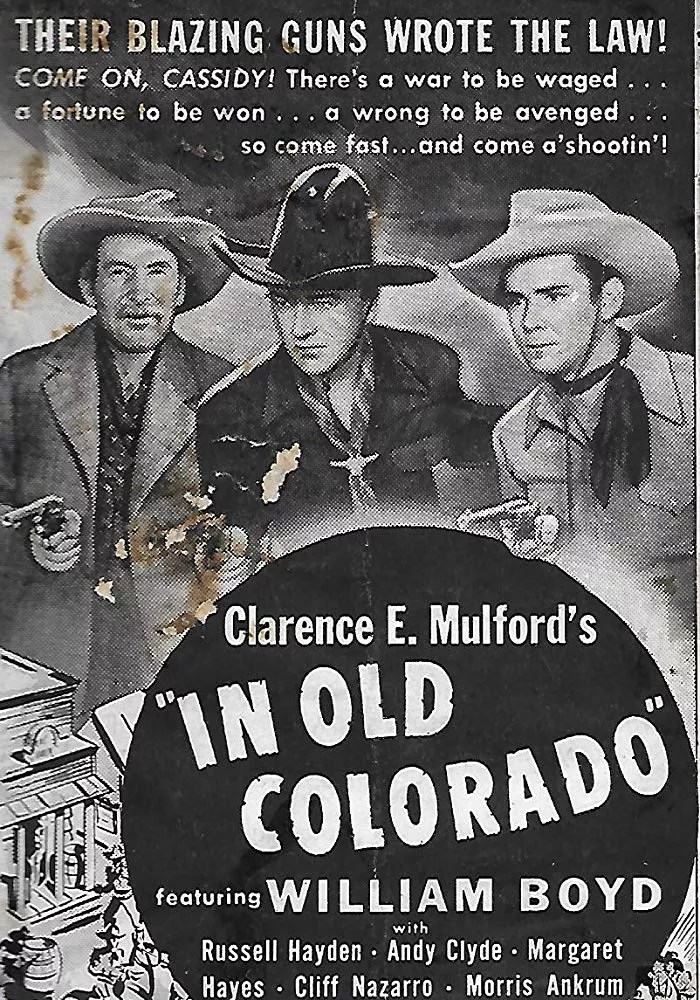 “The cast and crew of Paramount’s ‘Hopalong Cassidy’ Westerns returned once again to Lone Pine’s famous Alabama Hills for this above-average entry in the long-running series. Ma Woods (Sarah Padden) is about to lose her ranch due to the machinations of the not so neighborly George Davidson (Stanley Andrews), who refuses access to the only water in the vicinity. But unbeknownst to both Ma and the always law-abiding Davidson someone else is stoking the fires of the feud for his own greedy reasons. But who? Robbed en route to Ma Woods’ Colorado ranch, Hoppy (William Boyd), Lucky Jenkins (Russell Hayden) and California Carlson (Andy Clyde) manage to settle matters between Davidson and Mrs. Woods but the money to buy the Ma’s cattle seems to have vanished. According to some sources In Old Colorado was co-written by co-star Russell Hayden. The Western marked the debut under that moniker of leading lady Margaret Hayes, who had previously been billed Dana Dale.”