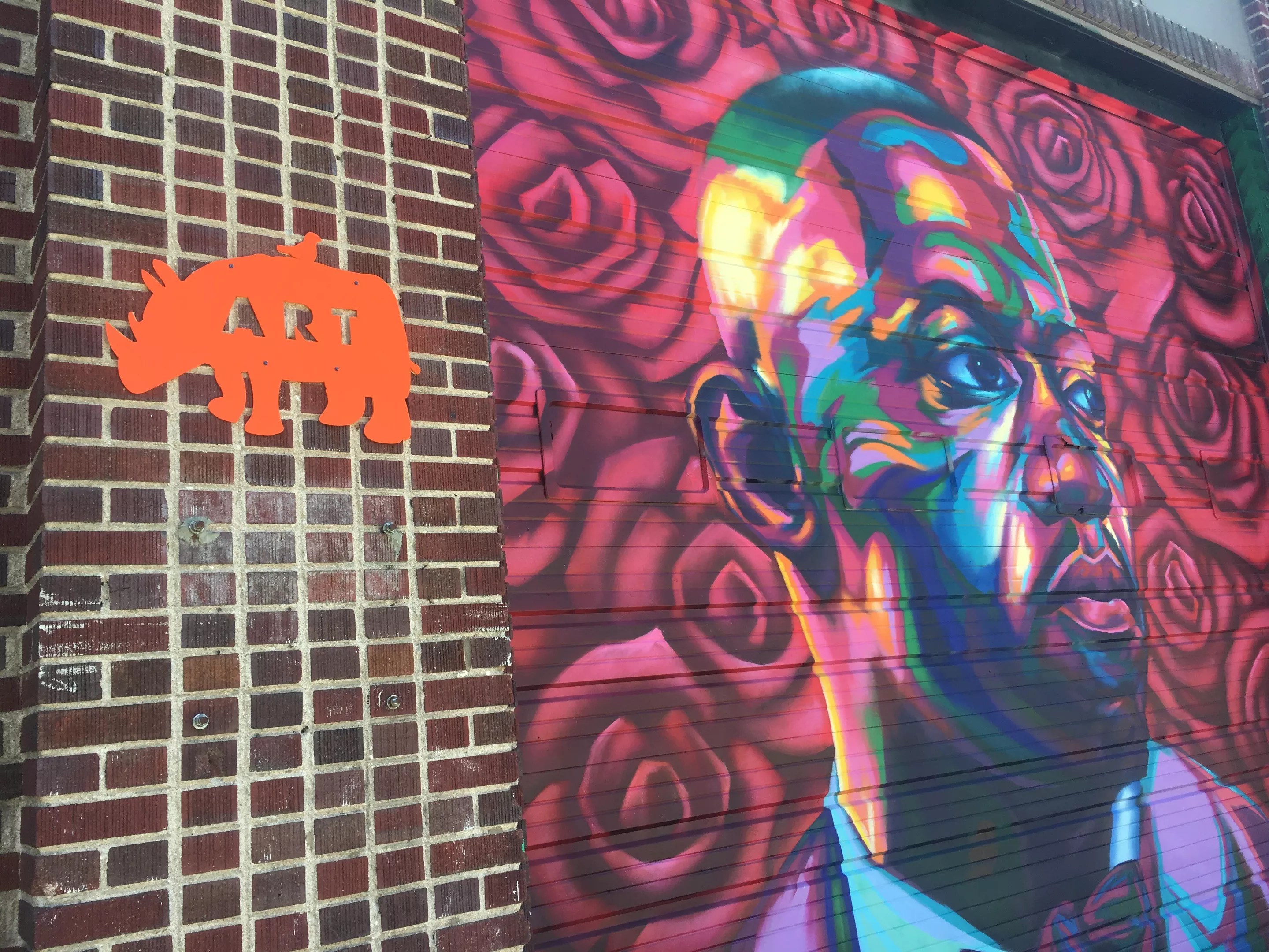 The RiNo symbol next to a mural by artist Detour (@detour303).