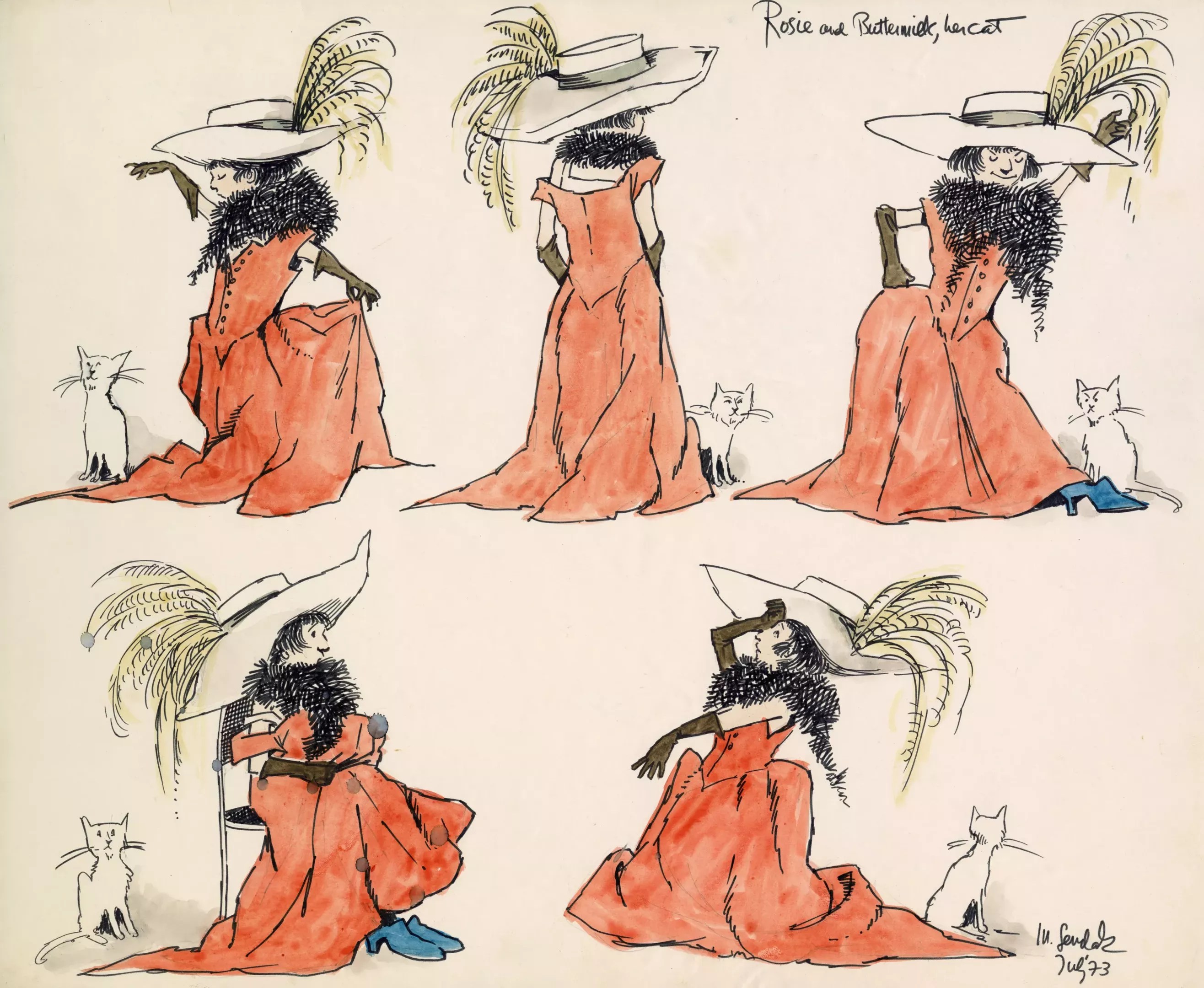 He would familiarize himself with the music for such works with his “fantasy sketches,” an exercise he started practicing in the ’50s. These pages show a succession of characters expressing their movements and telling stories in their own right. In a fantasy sketch for a Mozart quartet, an angry toddler is seen crying with his mouth gaping wider and wider until a goose climbs into it. Soon the goose is flying with the child, its feet still in his mouth, until he is dropped into a bipedal fish, which delivers the boy to his mother.