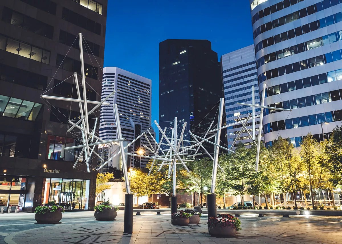 The face of Denver changed in the 1970s and ’80s, when some of the most important architects in the world – Gio Ponti, Minoru Yamasaki, Skidmore Owings Merrill (SOM), Kohn Pedersen Fox (KPF) and Phillip Johnson among them – created buildings downtown. This glorious era ended ignobly with the oil bust of the ’80s and, sad to say, the aesthetic and stylistic quality of Denver’s architecture has never recovered, with the exception of a stray notable building rising up here or there. Though some monumental sculptures accompanied these glamorous high-rises, most have been removed, including the monumental Harry Bertoia “Untitled (Sonambient)” that once stood in front of Yamasaki’s former Colorado National Bank tower. That makes the fabulous “Soft Landing,” one of Kenneth Snelson’s most significant commissions, a rare survivor from a list that was short to begin with.