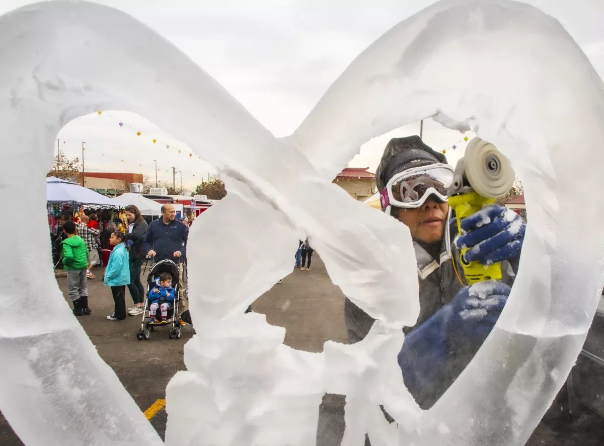 A master ice carver put the finishing touches on an Ice sculpture of two wood snakes.