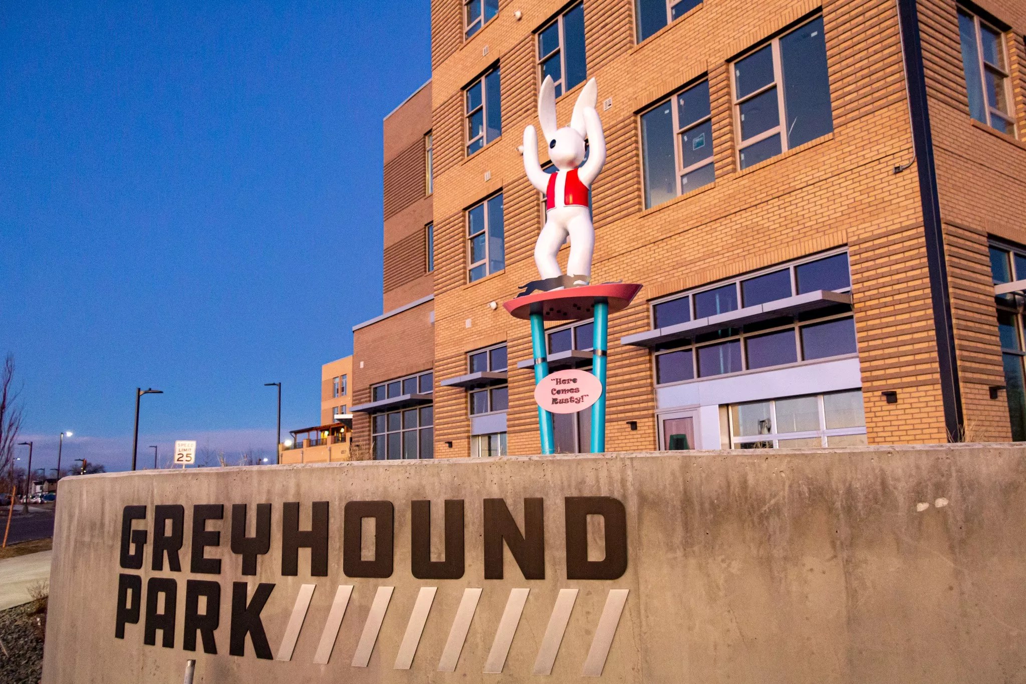 This newer addition won a Best of Denver award for Best New Public Art in 2023. Anyone old enough to remember the dog races at the Mile High Kennel Club probably remembers Rusty, the mechanical coursing rabbit, and the announcer’s eternal cry of “Here comes Rusty!” The city shut down greyhound racing in 2008, and the track sat empty until Commerce City Urban Renewal bought the land in 2011; redevelopment plans broke ground in 2020. In tribute to the land’s roots, local artists Los Supersónicos (aka Carlos Frésquez and Francisco Zamora) recently installed their rabbit sculpture, “Here Comes Rusty,” at the new Landing at Greyhound Park.
