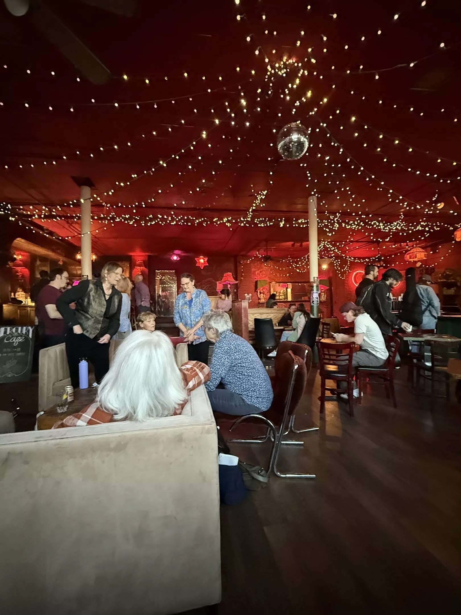 People waited downstairs in the Rose Room before being let into the Ballroom for the open mic.